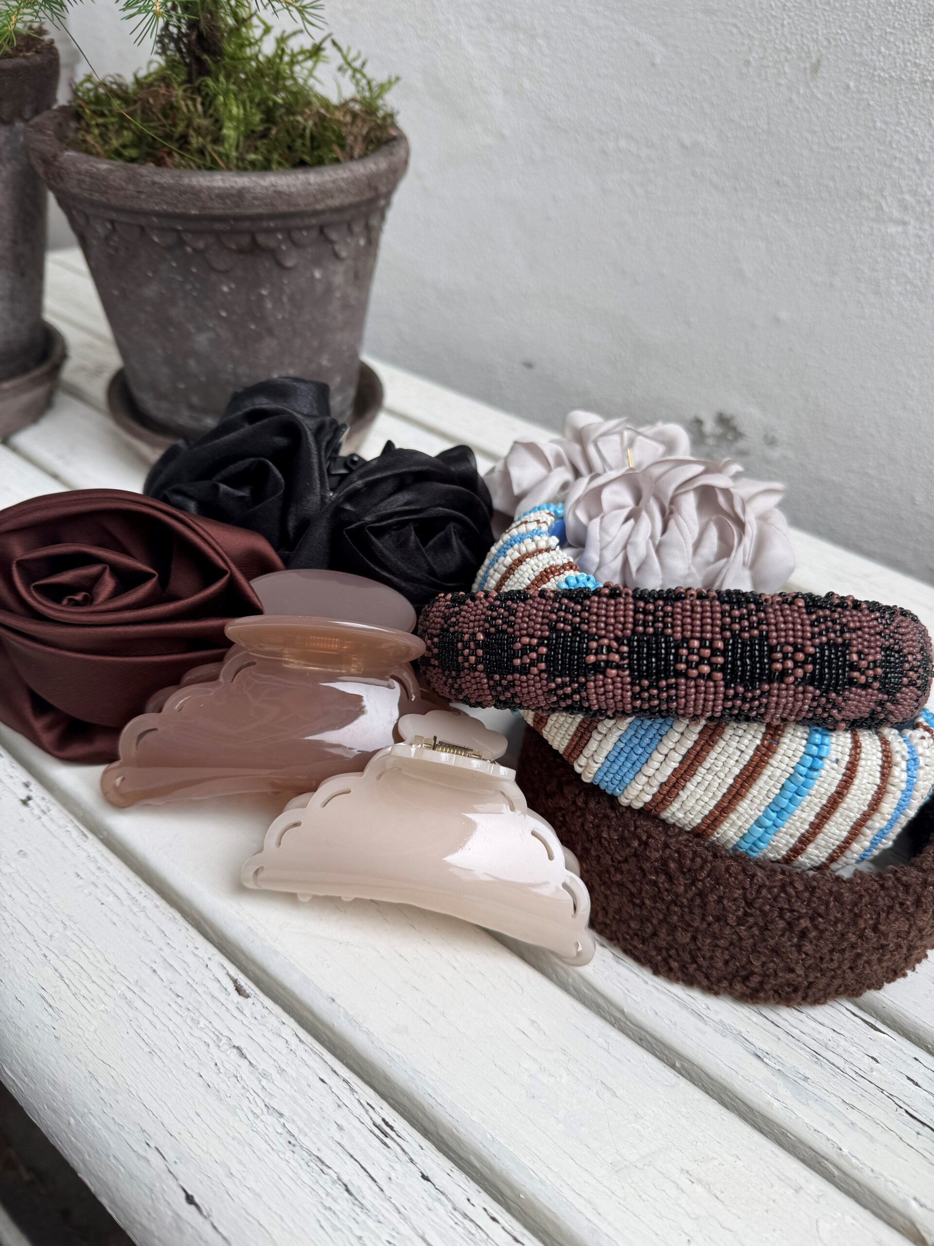 Hos Merci Give finder du et udvalg af hårpynt, der tilføjer det lille ekstra til dit look. Her på siden kan du gå på opdagelse i elegante hårbøjler, fine spænder, scrunchies og dekorative hårclips – perfekte til både hverdag og festlige lejligheder. Vores hårpynt er nøje udvalgt med fokus på kvalitet, komfort og æstetik, så du kan style dit hår med personlighed og finesse.