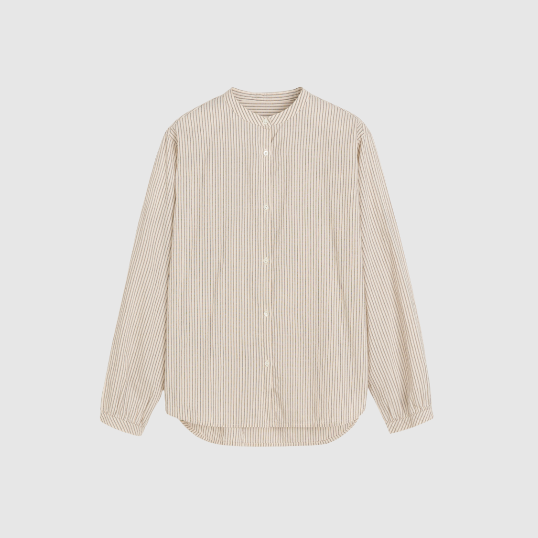 Bibs Shirt Epure er en feminin og elegant skjorte designet uden krave, fremstillet i blød, ufarvet økologisk bomuld. Det lette materiale er vævet med kontrastfarvede striber, som skaber et raffineret og moderne udtryk. Skjorten har en regulær pasform, delikate perlemorsknapper, dekorative rynkedetaljer ved bærestykket og voluminøse ærmer, der tilsammen giver et eksklusivt og luftigt fald.