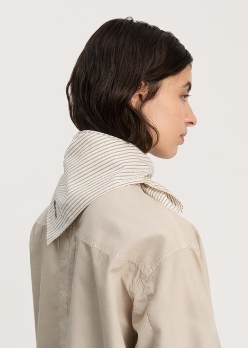 Charlie Scarf Epure er et let og elegant mini‑tørklæde fremstillet i blød, ufarvet økologisk bomuld. Det er vævet med fine kontrastfarvede striber, som giver et tidløst, minimalistisk udtryk. Det kvadratiske design gør det nemt at style — fold det én gang rundt om halsen for et klassisk, sofistikeret look, eller brug det som et lille accessory i håret eller på tasken.