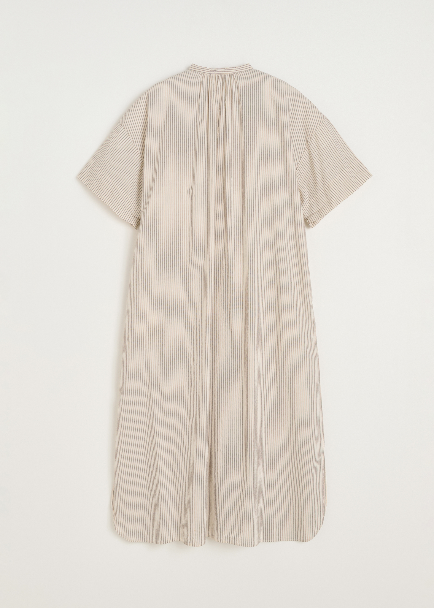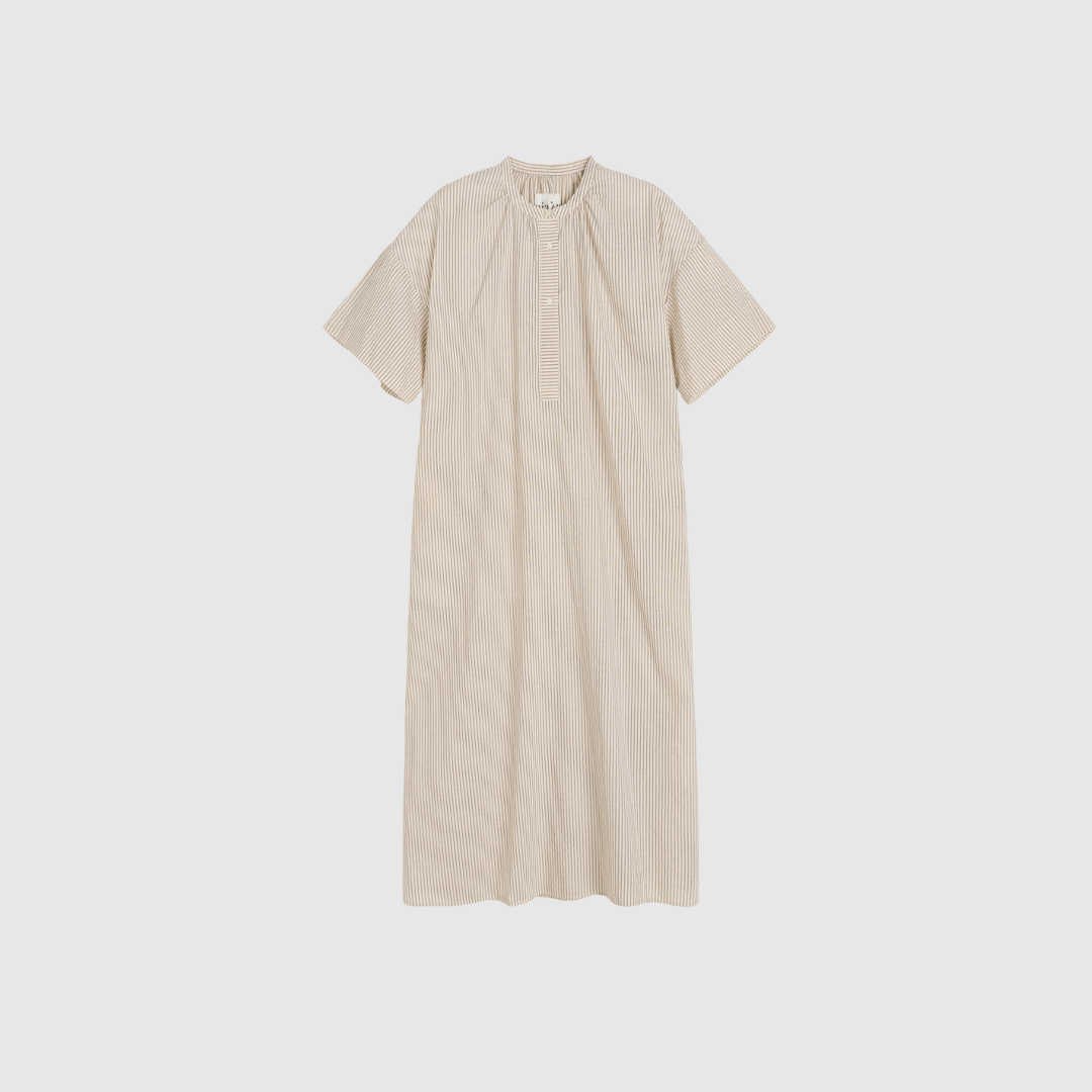 Cille Dress Epure er en elegant, lang kjole fremstillet i blød, ufarvet økologisk bomuld. Den er vævet med kontrastfarvede striber, som giver et raffineret og let grafisk udtryk. Kjolen har et lige snit med sænkede skuldre, fine perlemorsknapper og praktiske sidelommer. Den runde hals åbner op for en unik rynkedetalje, der tilfører volumen og en smuk, afrundet silhuet. En stilren og komfortabel kjole, der kan bruges både til hverdag og finere anledninger.
