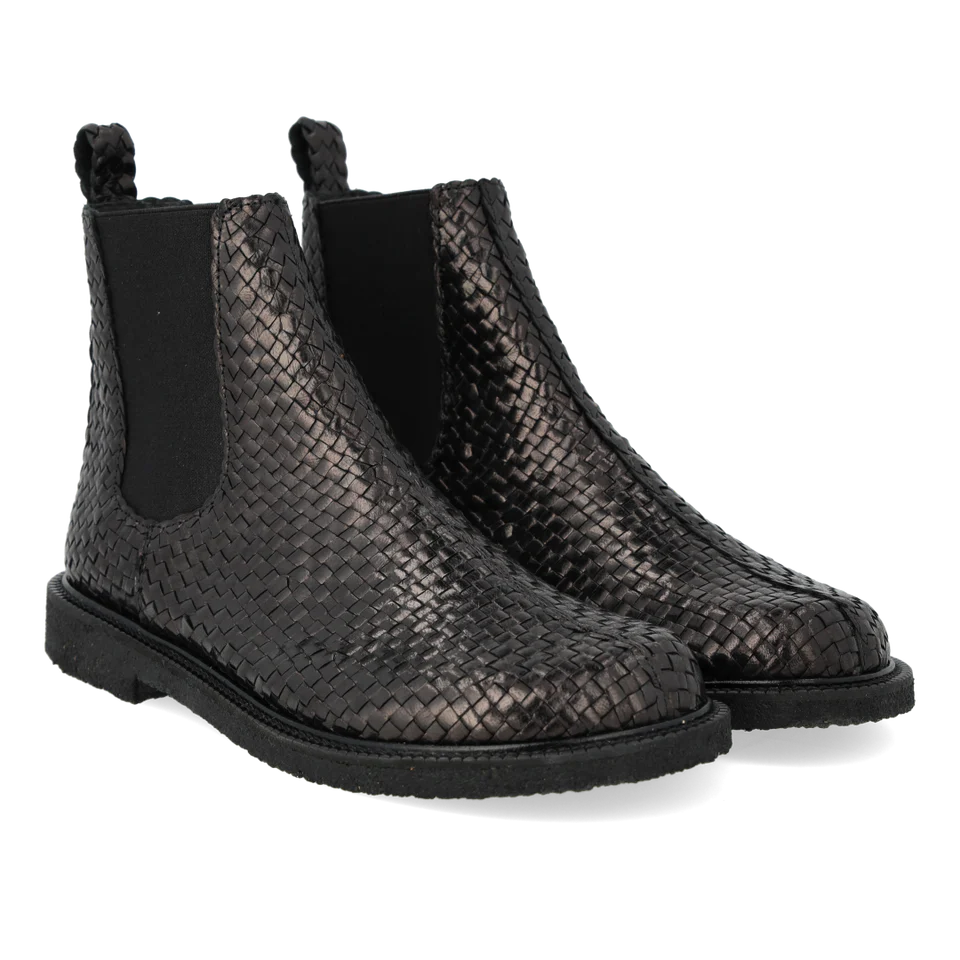 En smuk og håndlavet Chelsea-støvle fra Angulus med flettet overdel og klassisk sort finish. Støvlen har en rummelig pasform og er designet med funktionelle elastiksider og hælstrop, som gør den nem at tage af og på. Den bløde rågummisål og vatterede indersål sikrer komfort hele dagen.