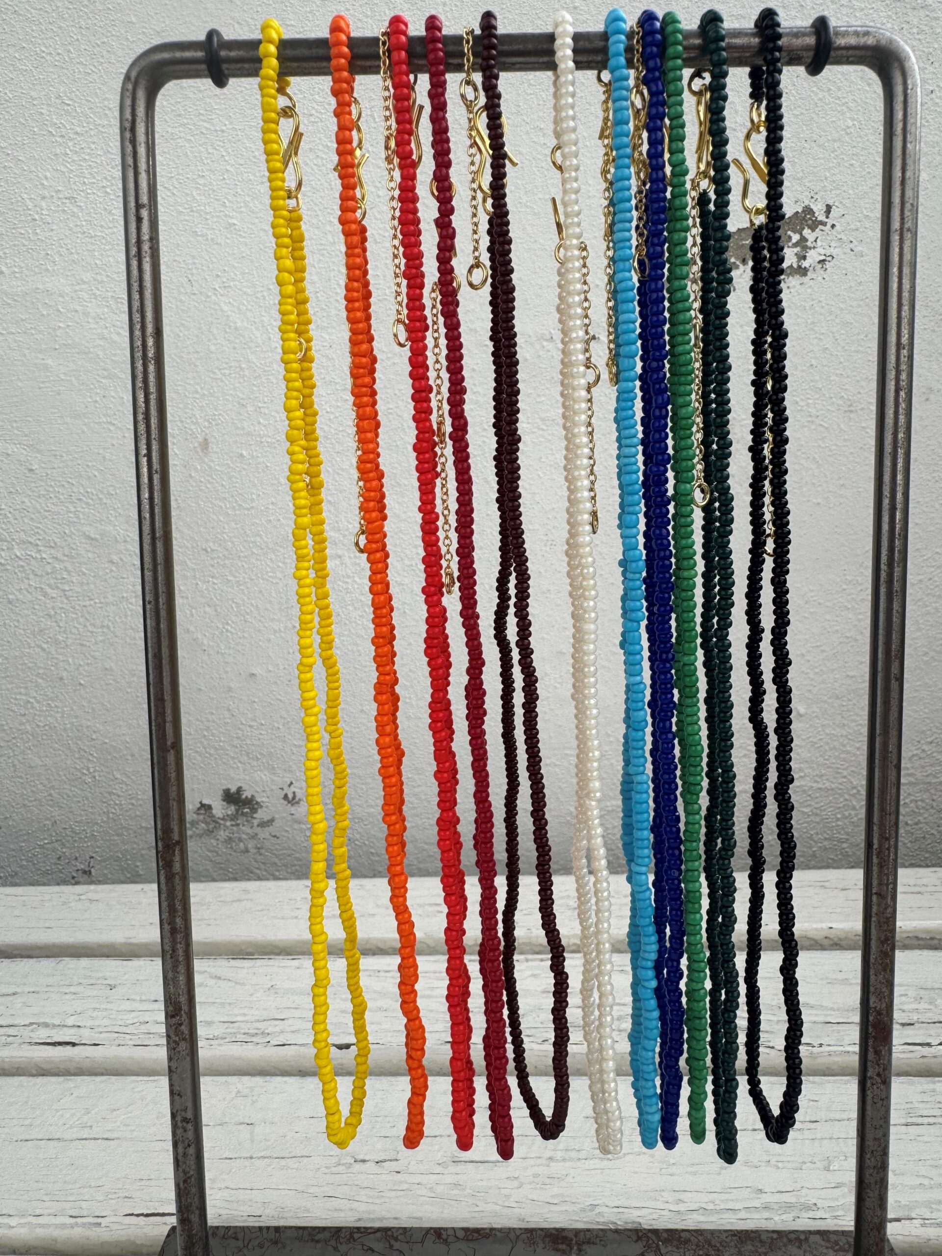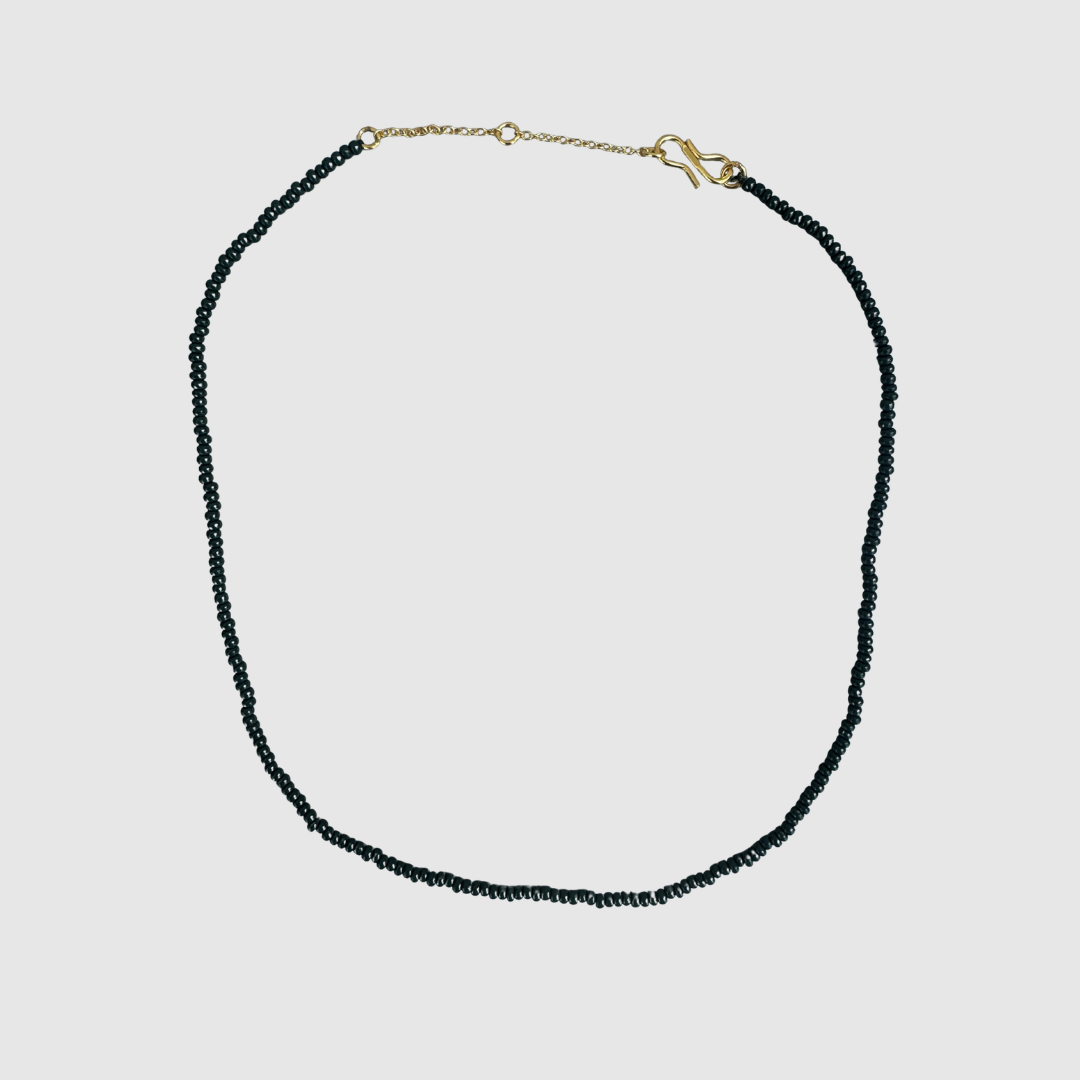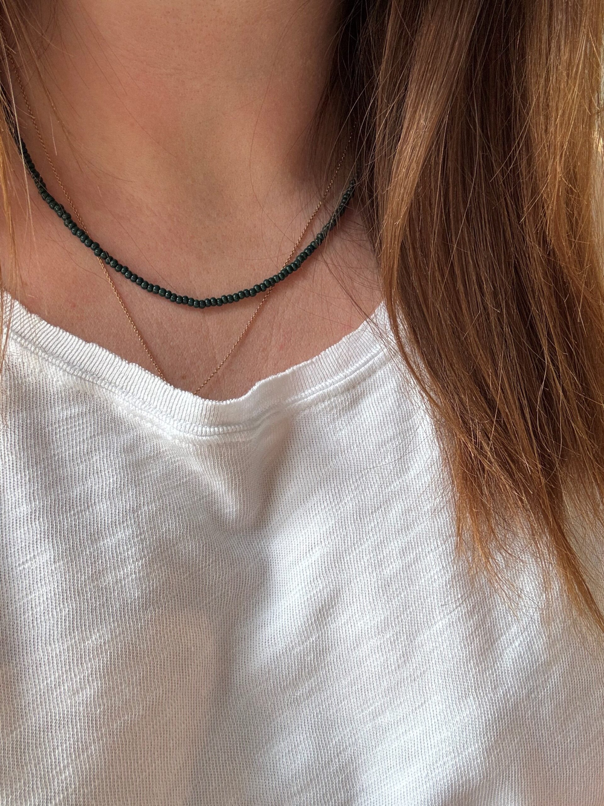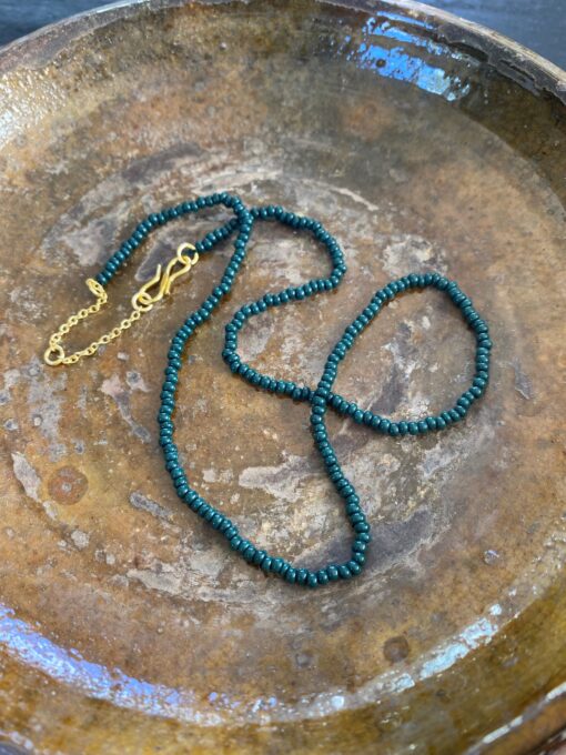 Tilføj et strejf af farve og personlighed til dit look med denne håndlavede mørkegrønne perlehalskæde fra Annavii. Halskæden er enkel og stilfuld – designet i ensfarvede perler og afsluttet med en elegant forgyldt s-lås samt justerbar forlængerkæde.