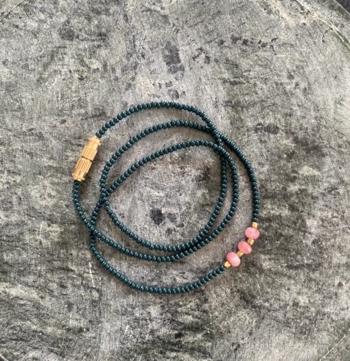NURI-halskæden fra Annavii er et elegant og tidløst smykke, der kombinerer dybgrønne glasperler med en smukke Cherry Quartz sten som midtpunkt. Halskæden er afsluttet med messing, der gør den nem at tage af og på, samtidig med at den tilføjer et eksklusivt præg. Perfekt til både hverdag og festlige lejligheder.