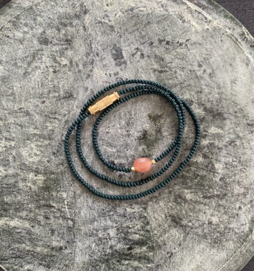 NURI-halskæden fra Annavii er et elegant og tidløst smykke, der kombinerer dybgrønne glasperler med en smuk peach moonstone som midtpunkt. Halskæden er afsluttet med messing, der gør den nem at tage af og på, samtidig med at den tilføjer et eksklusivt præg. Perfekt til både hverdag og festlige lejligheder.