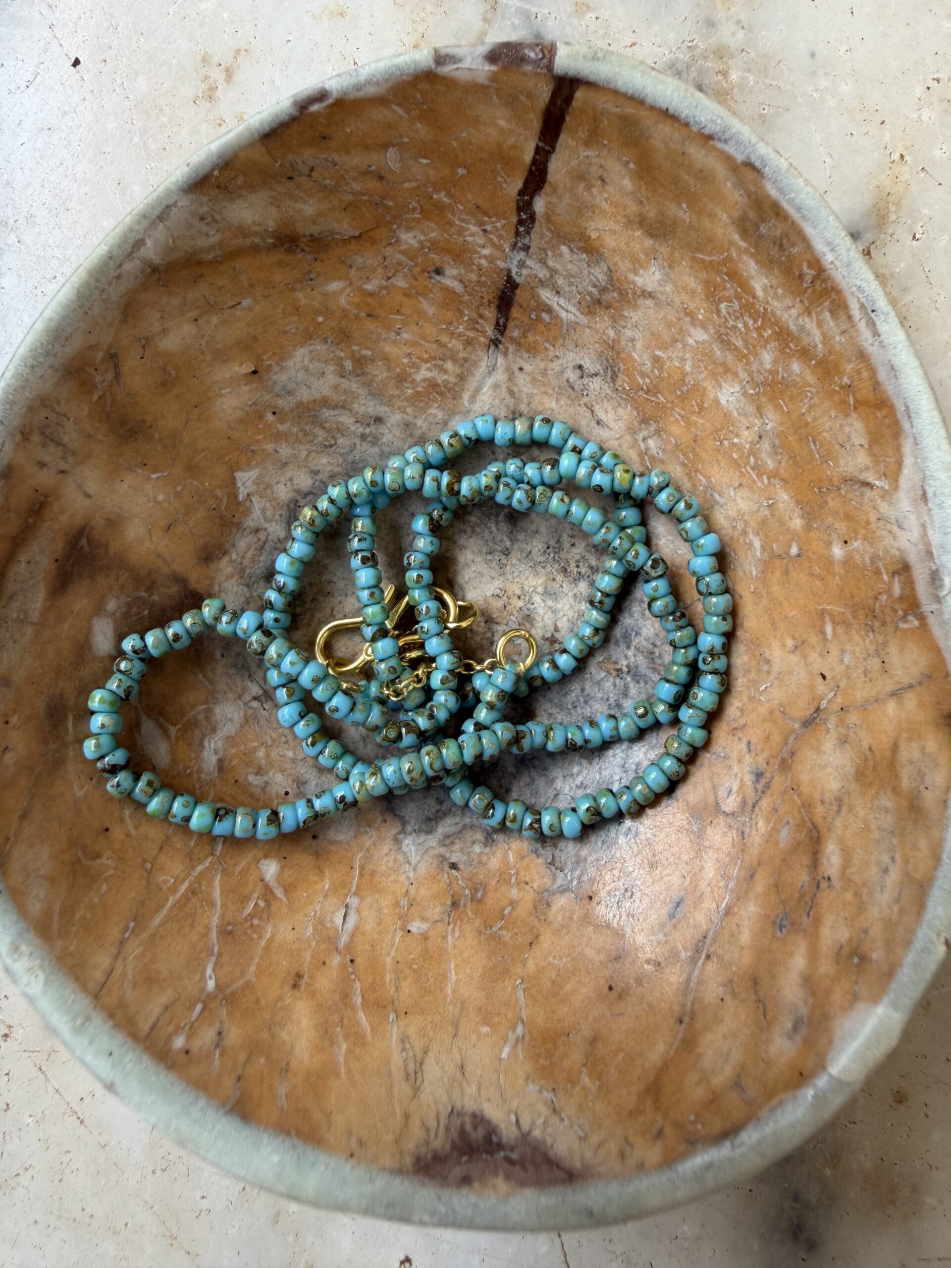 Reena i turkis er perfekt både solo for et roligt, elegant udtryk – eller i kombination med andre kæder for et lag‑på‑lag look. Den fungerer lige godt til lyse forårsfarver, varme sommerlooks og dybere efterårsnuancer, hvor den turkise tone får lov at stå frem som et farverigt highlight.