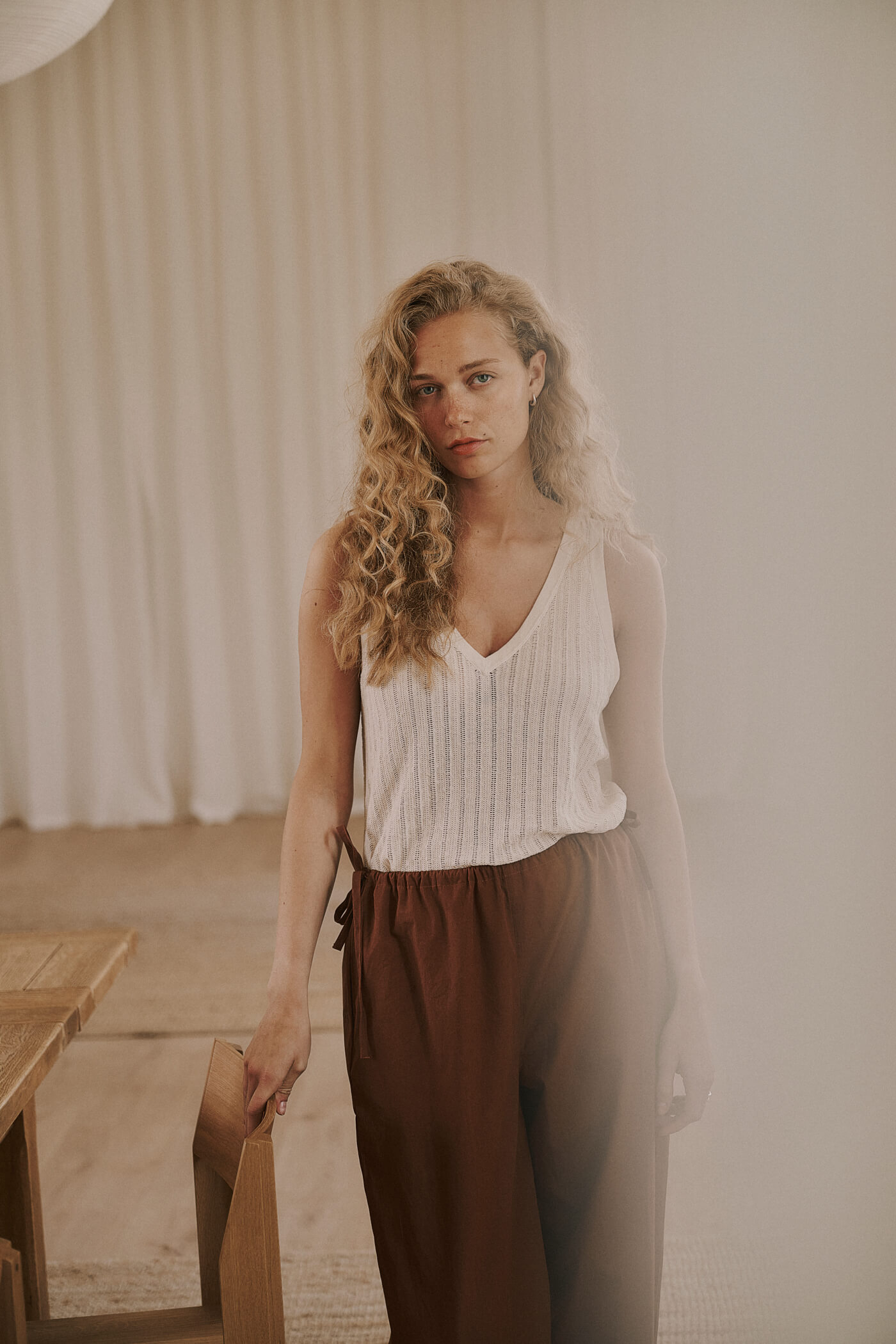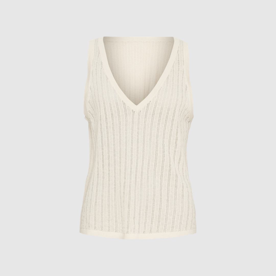 Amelia SL Knit Top i farven White Sand er en elegant, let og eksklusiv ærmeløs striktop, fremstillet i en luksuriøs silkeblanding. Den luftige konstruktion giver et smukt fald og en utrolig behagelig pasform, som føles let og kølig mod huden.