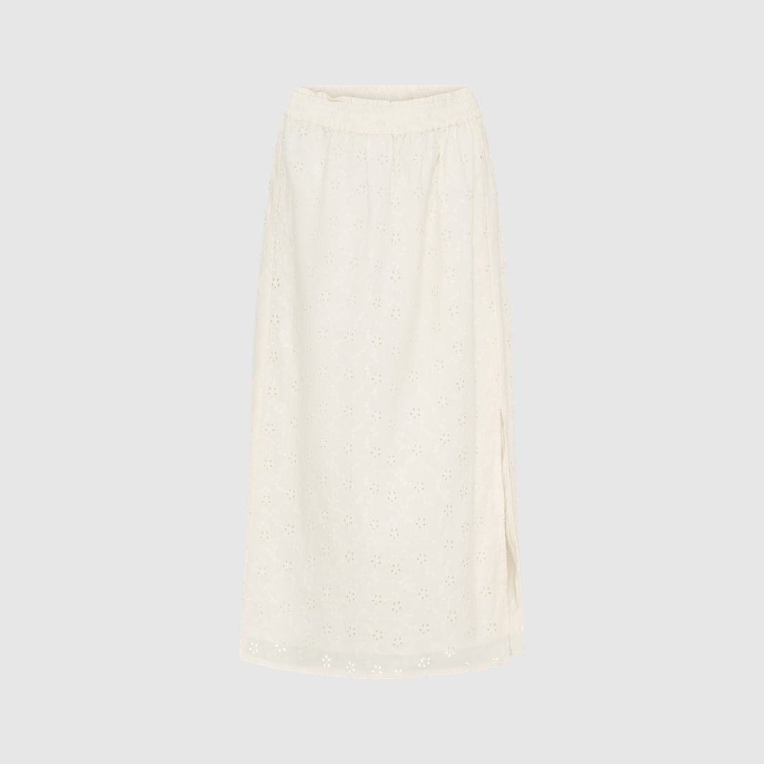 Melody Midi Skirt i farven White Sand er en romantisk, feminin og sommerlig nederdel i smuk broderie anglaise. Nederdelen har en klassisk midi‑længde, der giver et elegant, let og luftigt udtryk, perfekt til både hverdagsbrug, ferier og særlige anledninger. Den er designet med en elastisk linning, som sikrer optimal komfort og en fleksibel pasform, der tilpasser sig kroppen uden at stramme.