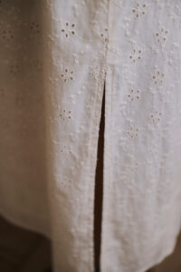 Et af nederdelens smukke detaljer er den asymmetriske, off‑center slids, som giver ekstra bevægelsesfrihed og et moderne twist, der bryder den romantiske silhuet på en stilfuld måde. Broderie anglaise‑mønsteret tilføjer struktur, lethed og et eksklusivt udtryk, mens nederdelen er fuldt foret med blød bomuld, så den ikke er gennemsigtig og føles behagelig mod huden.