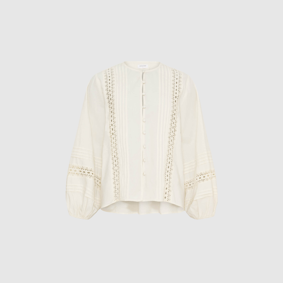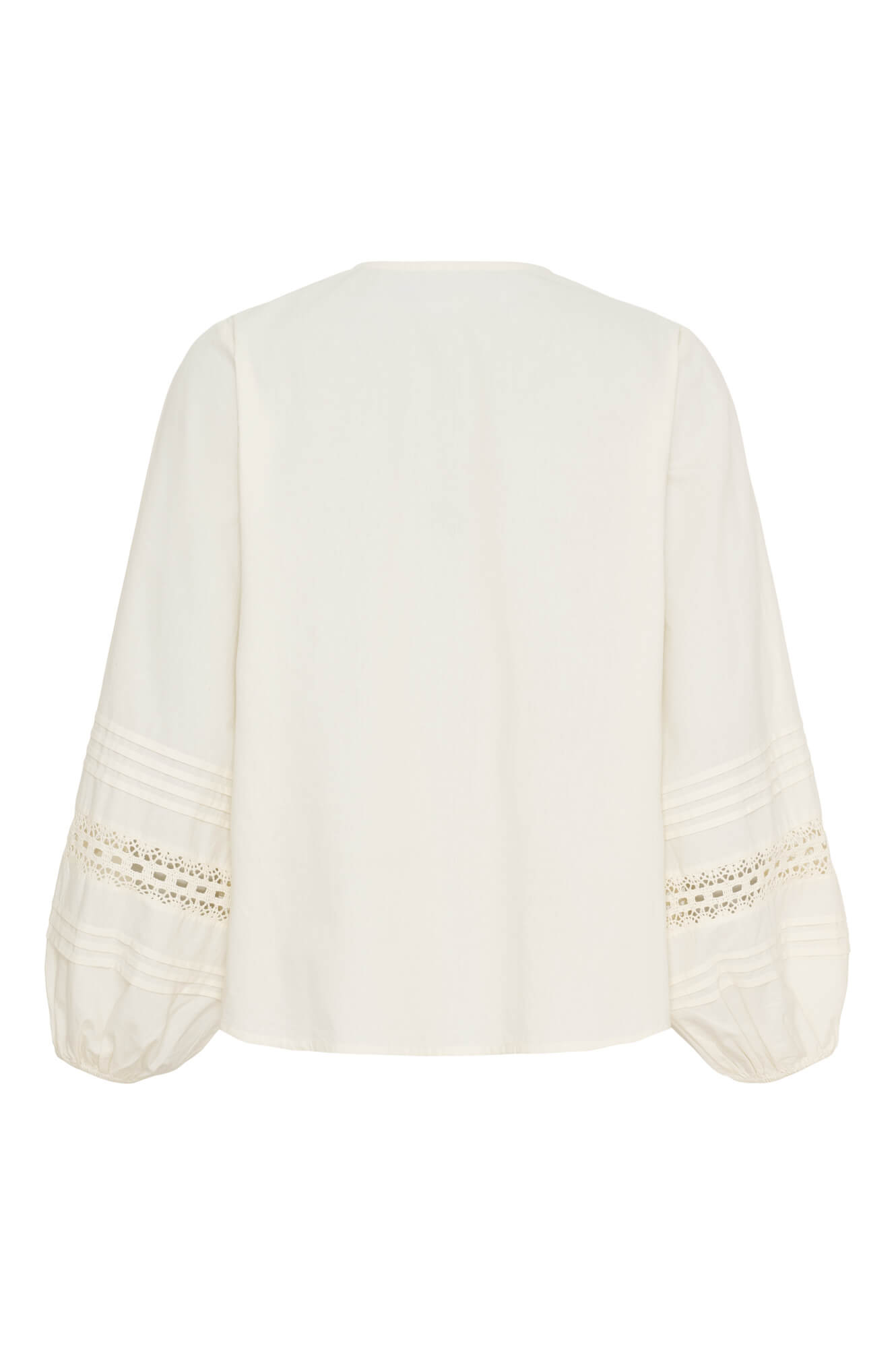 Modellen er designet med beklædte stofknapper, fine lægsyninger (pleats) og delikate crochet‑detaljer, som tilsammen skaber et elegant og eksklusivt udtryk. De smukke ballonærmer med elastiske manchetter tilfører skjorten et moderne og feminint touch, mens den lette struktur i bomulden giver et naturligt og luftigt fald.
