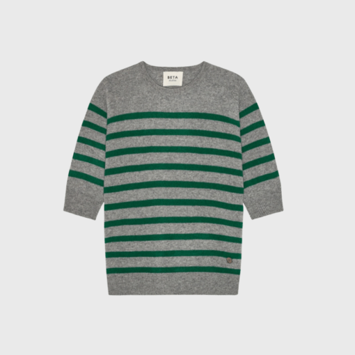 Bianca Striped Lady Sleeve Cashmere er en eksklusiv og tidløs striktrøje fra Beta Studios, skabt i 100% luksuriøs cashmere for en blød og behagelig kvalitet. Designet har en elegant, lige silhuet med lange lady sleeves, rund hals og et klassisk stribet mønster i grå og grøn. Perfekt til både hverdagsbrug og mere sofistikerede looks, hvor komfort og stil går hånd i hånd.
