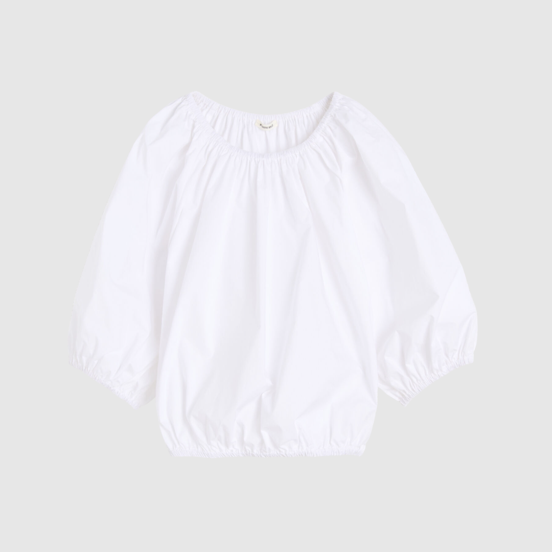 Den har en cropped, voluminøs silhuet med raglanærmer og elastiske manchetter, som giver det karakteristiske BMB‑look. Den buede kant, den diskrete knaplukning i nakken og de enkle linjer gør blusen til et sofistikeret, men afslappet wardrobe essential.