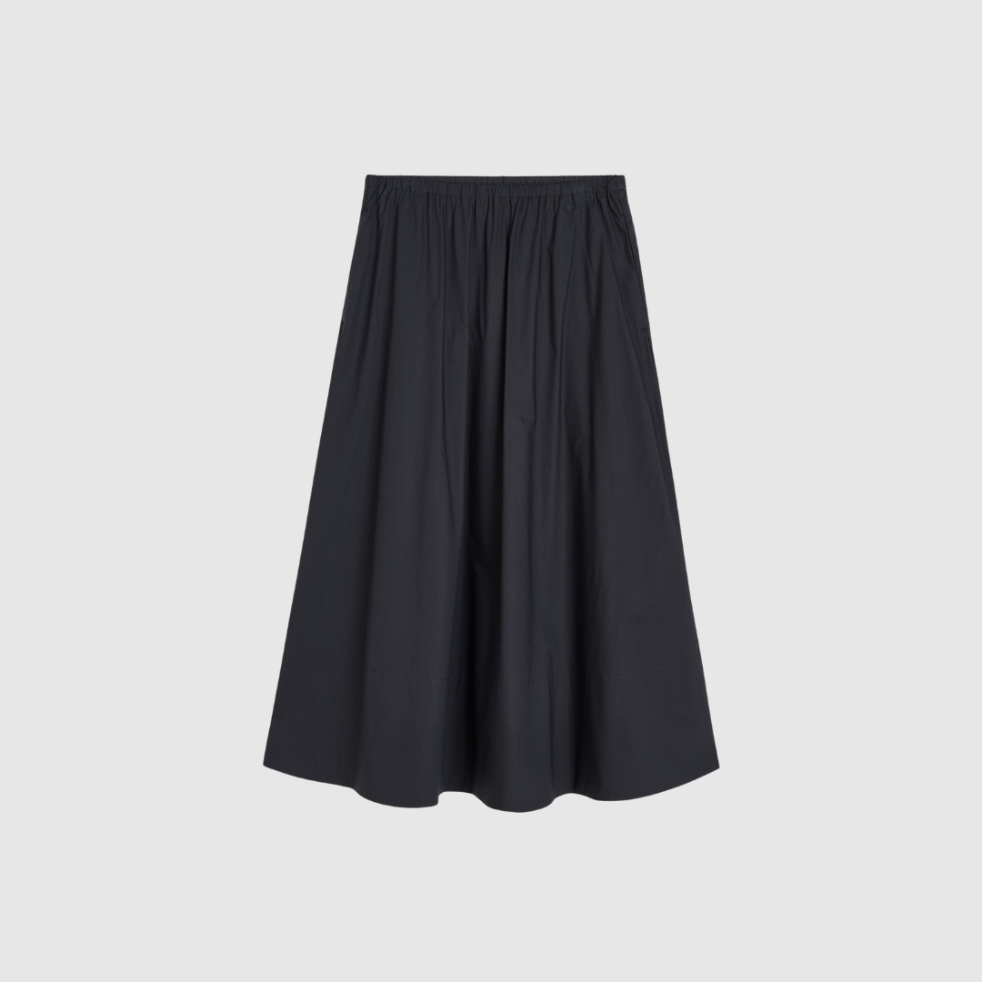 Den højtaljede pasform giver et flatterende snit, mens det lange, enkle fald understreger nederdelens elegante helhedslook. Et stilrent must‑have, der glider direkte ind i enhver moderne garderobe.