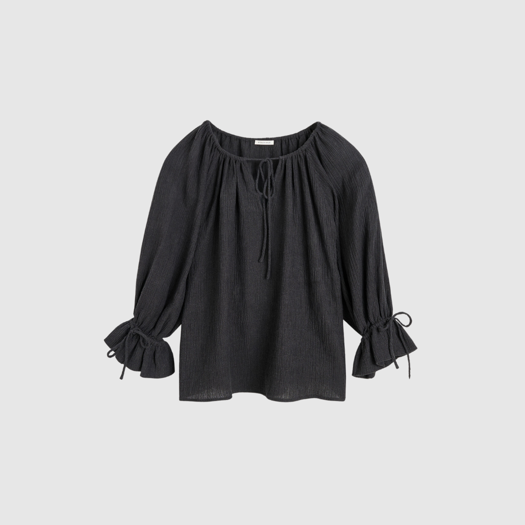 ROSE WEAVE BLUSE er en elegant, let og alsidig bluse, der kombinerer et eklektisk udtryk med maksimal komfort. Blusen har en løs pasform og er designet med en flot krave, dyb V‑udskæring og justerbare bindebånd, som gør det muligt at style den både afslappet og mere festligt.
