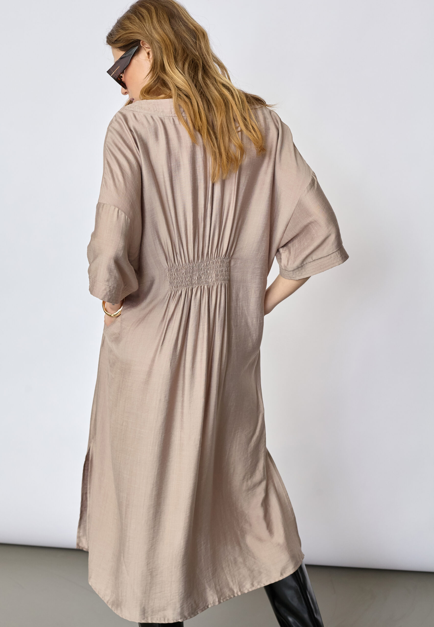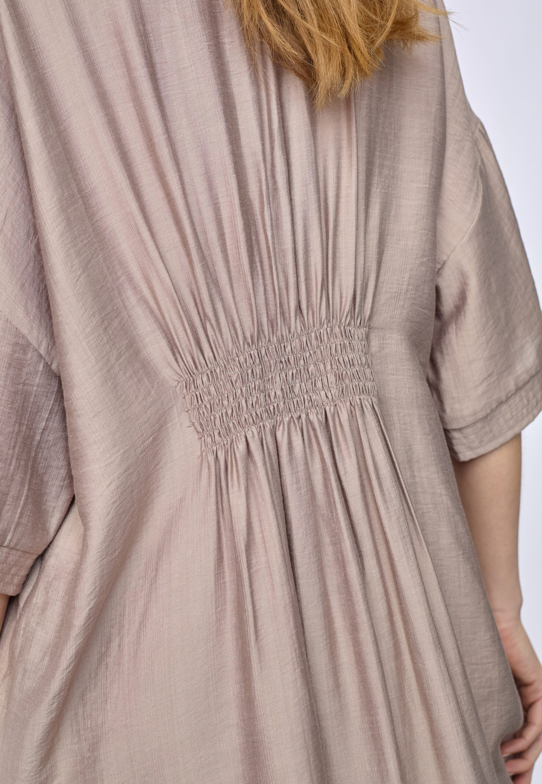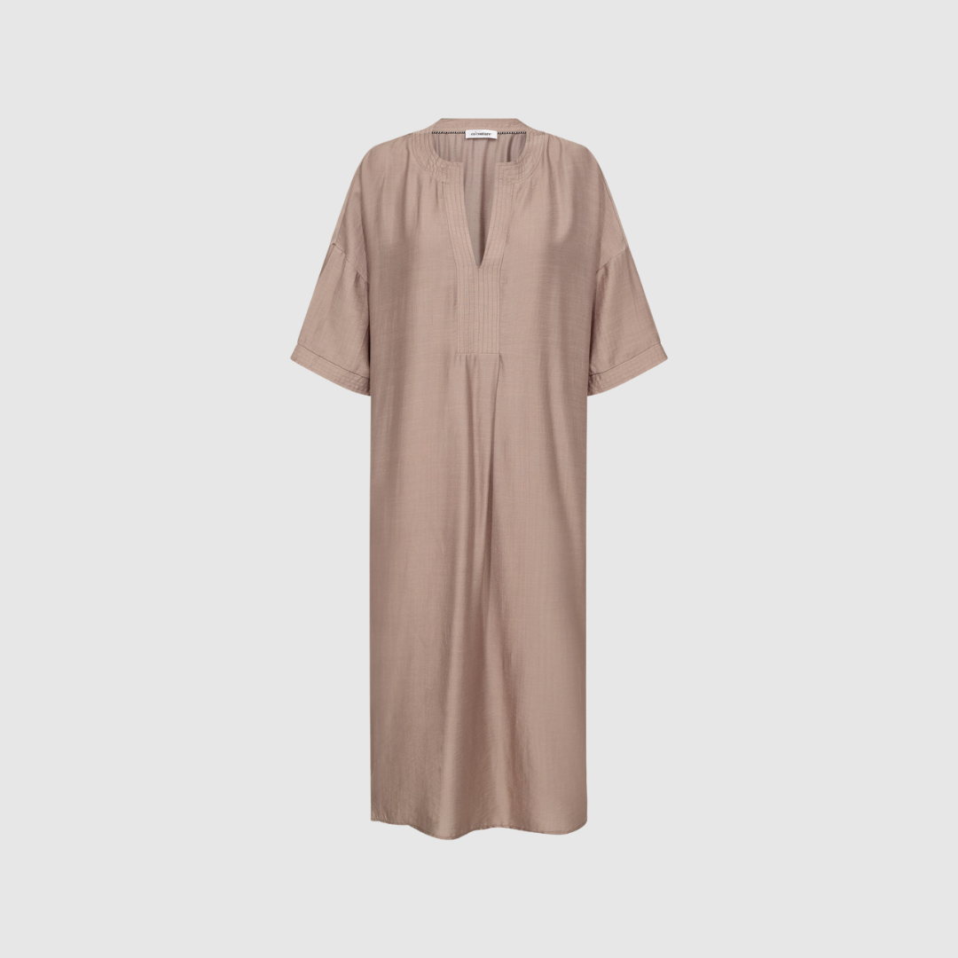 Den løse tunika‑inspirerede silhuet giver høj komfort og et ubesværet fald, mens den varme walnut‑farve tilfører dybde og et eksklusivt udtryk. Farven er nem at style med både neutrale toner og mørkere accessories og gør kjolen velegnet til brug på tværs af sæsoner.