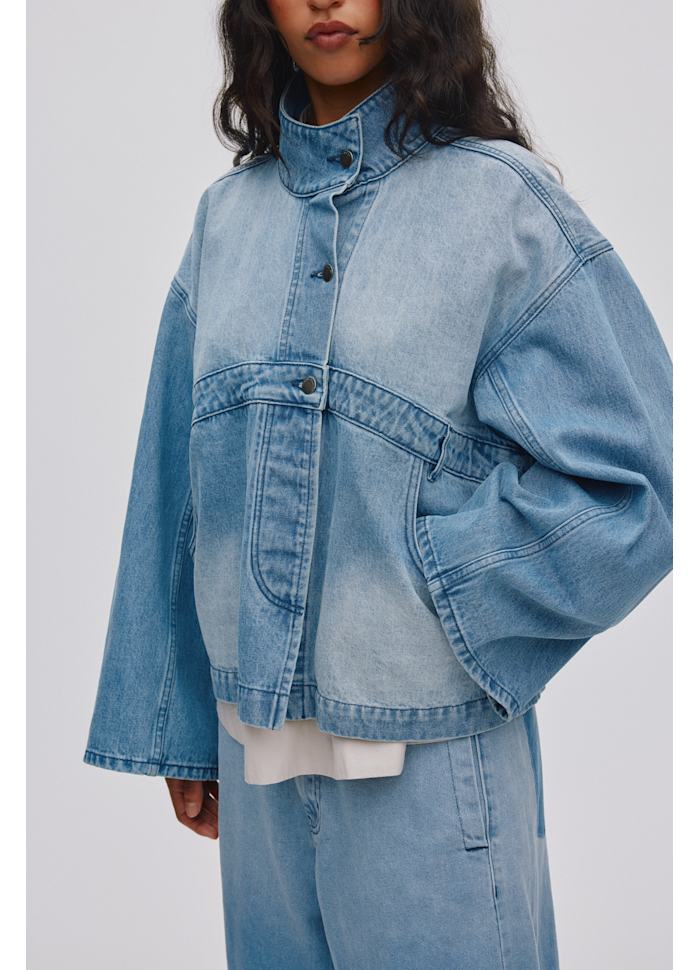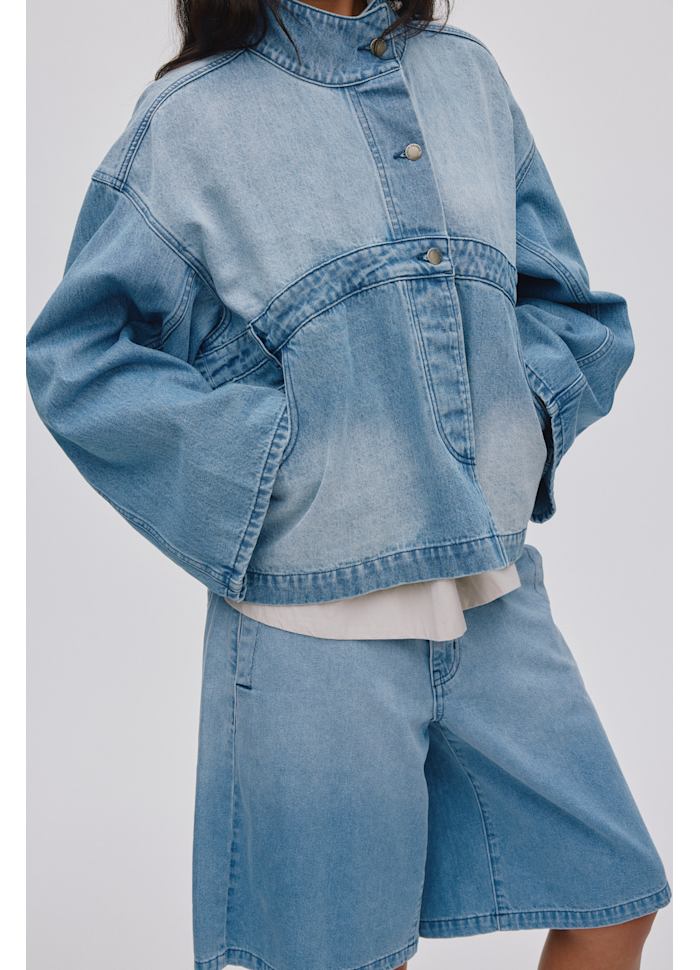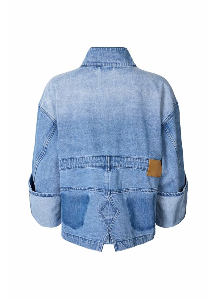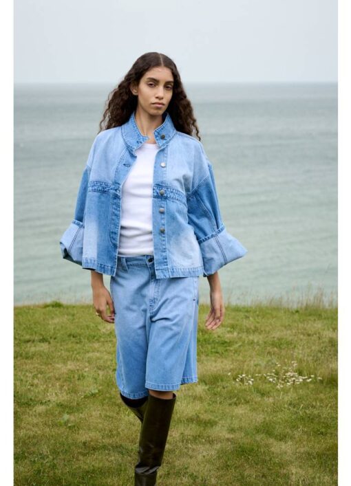 Donela denimjakken er et markant og moderne bud på en klassisk denimjakke. Den er udført i en lys, forvasket denim, som giver et cool og afslappet udtryk. Jakken har et kort og oversized fit, der skaber en flatterende og nutidig silhuet, mens de brede, opsmøgede ærmer og store sidelommer tilføjer karakter og visuel kant.