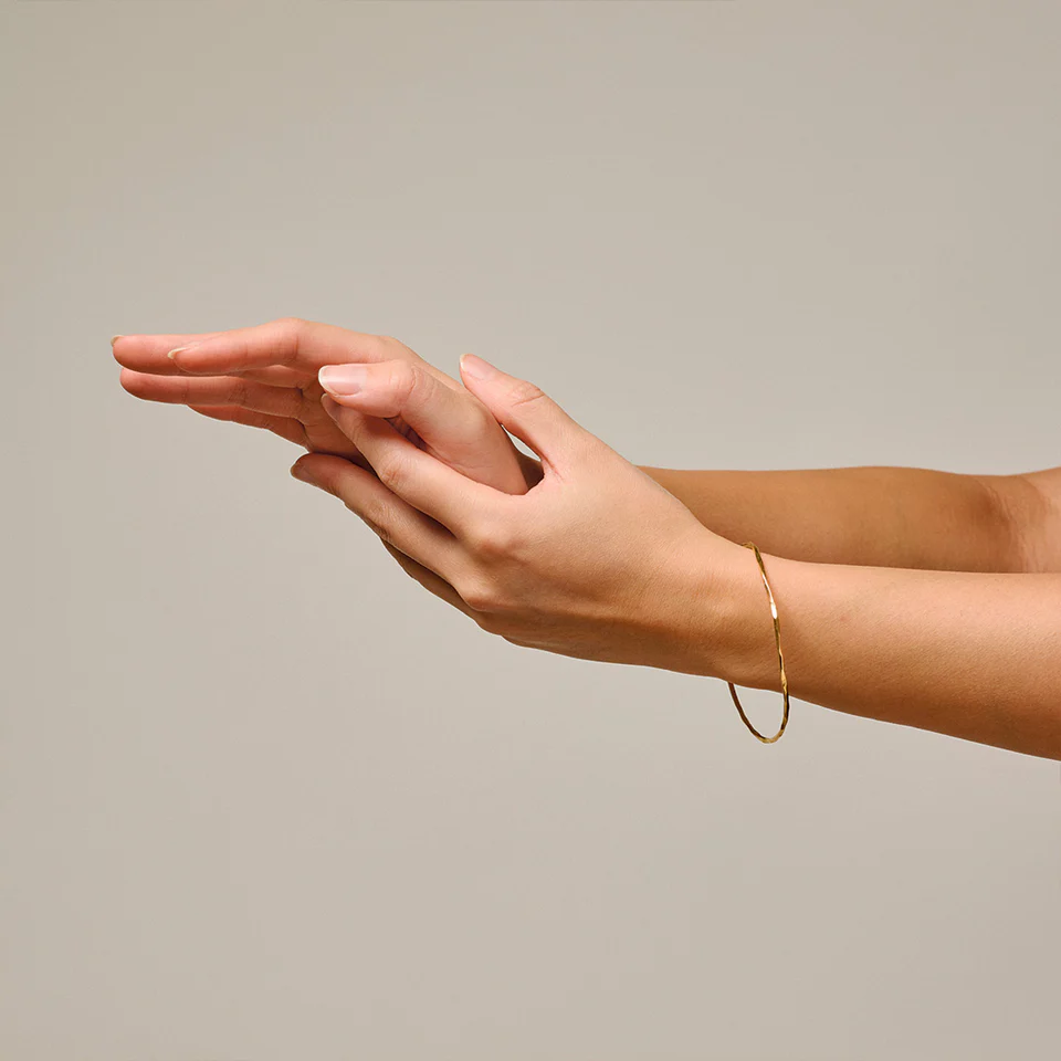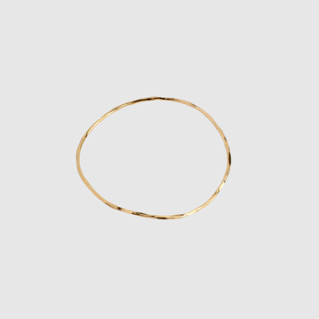 Organic Arena Bangle fra ENAMEL Copenhagen er et elegant og tidløst armbånd med et smukt, organisk og hamret udtryk, der giver overfladen liv og karakter. Det ultratynde design gør armbåndet let og raffineret, næsten svævende om håndleddet, samtidig med at det tilfører et eksklusivt, minimalistisk touch til looket.