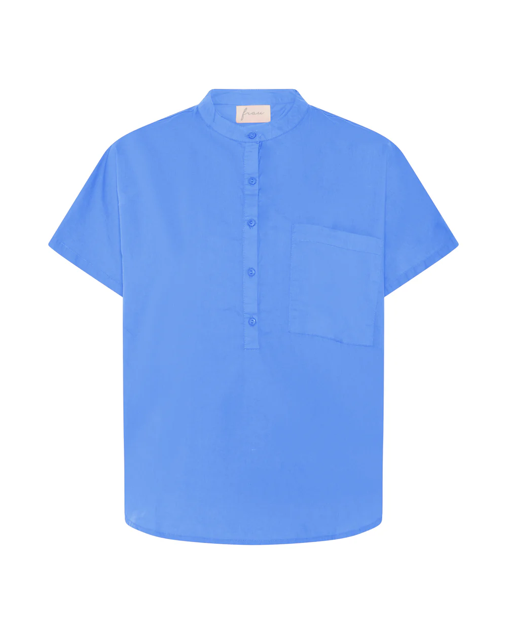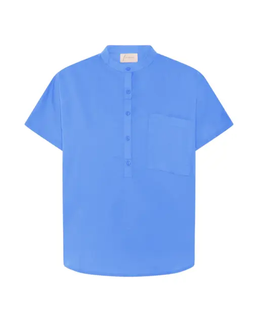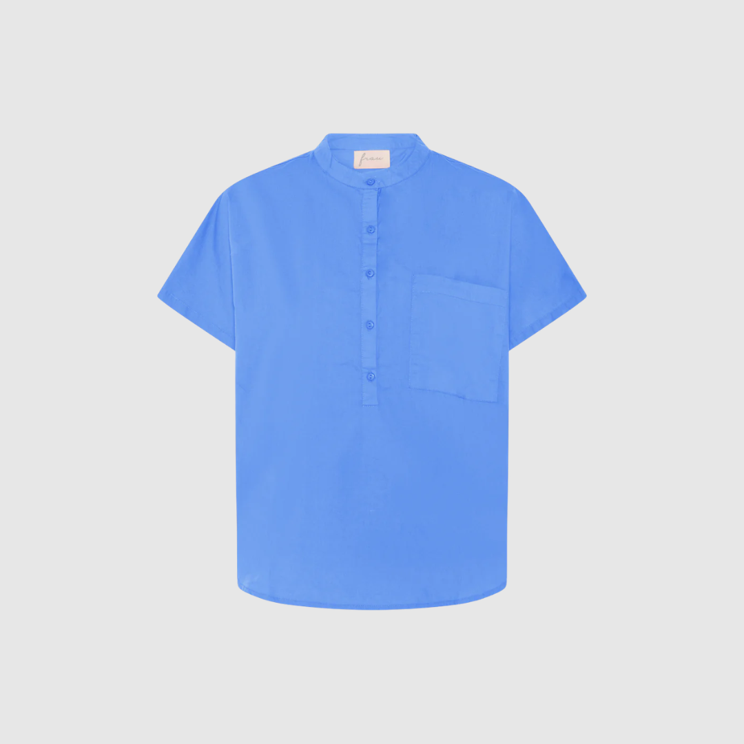Toppen har en fin kinakrave og en halv stolpelukning, som giver den et rent og stilfuldt look. Den lille brystlomme tilføjer et sporty touch, der passer perfekt ind i FRAUs univers af simple, nordiske og funktionelle styles.