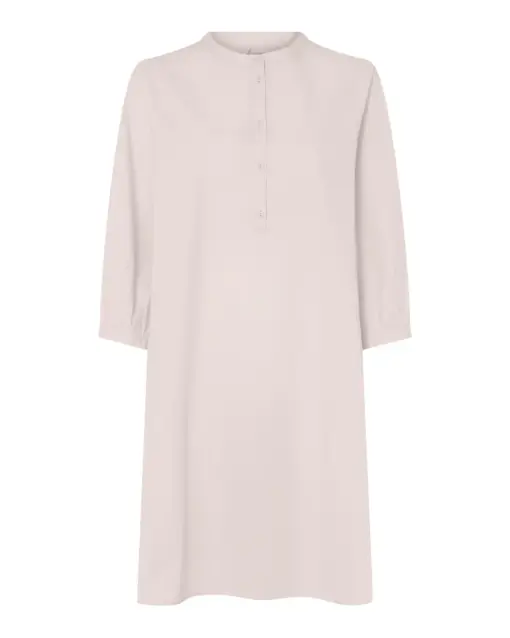 Kjolen har en klassisk kinakrave og en halv stolpelukning, som giver et rent og sofistikeret udtryk. Med sin knælange pasform, rummelige 3/4‑ærmer og afrundede kant forneden falder kjolen smukt og let om kroppen.