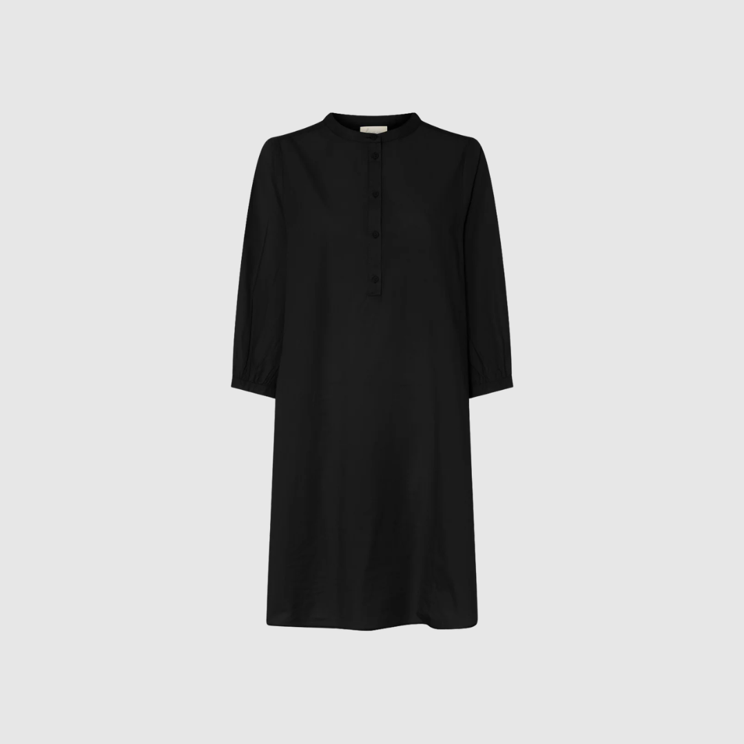 Madrid Kort Kjole i sort er en elegant og afslappet skjortekjole fra FRAU, designet i et tidløst udtryk med rene linjer og feminine detaljer. Kjolen har en klassisk kinakrave og en halv stolpelukning, som giver et let, sofistikeret look.