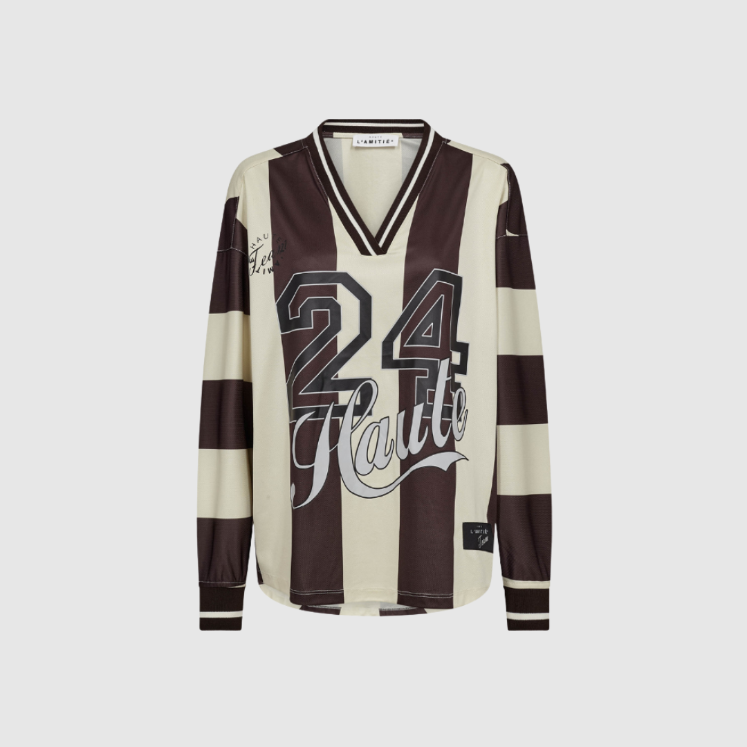 Haute 24 Stripe Blouse fra Haute L’Amitié er en moderne og stilfuld bluse i den elegante farvekombination Mocca / Pearl. Modellen er designet med en afslappet oversize pasform, V‑udskæring og lange ærmer med ribkanter, hvilket giver et sporty, men samtidig feminint og klassisk udtryk. En alsidig must-have style, der fungerer perfekt til både hverdagsbrug og mere festlige lejligheder.