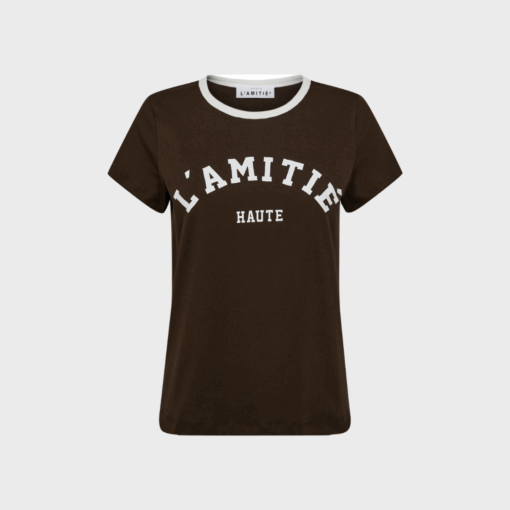 Neckline Logo Tee er en moderne t-shirt fra HAUTE L’AMITIÉ, designet i en flot mørk mocca nuance med kontrastfarvet hvid ribkant i halsen. På fronten prydes t-shirten af et iøjnefaldende “L’AMITIÉ HAUTE”-logo i hvid, som giver et cool og sporty look.