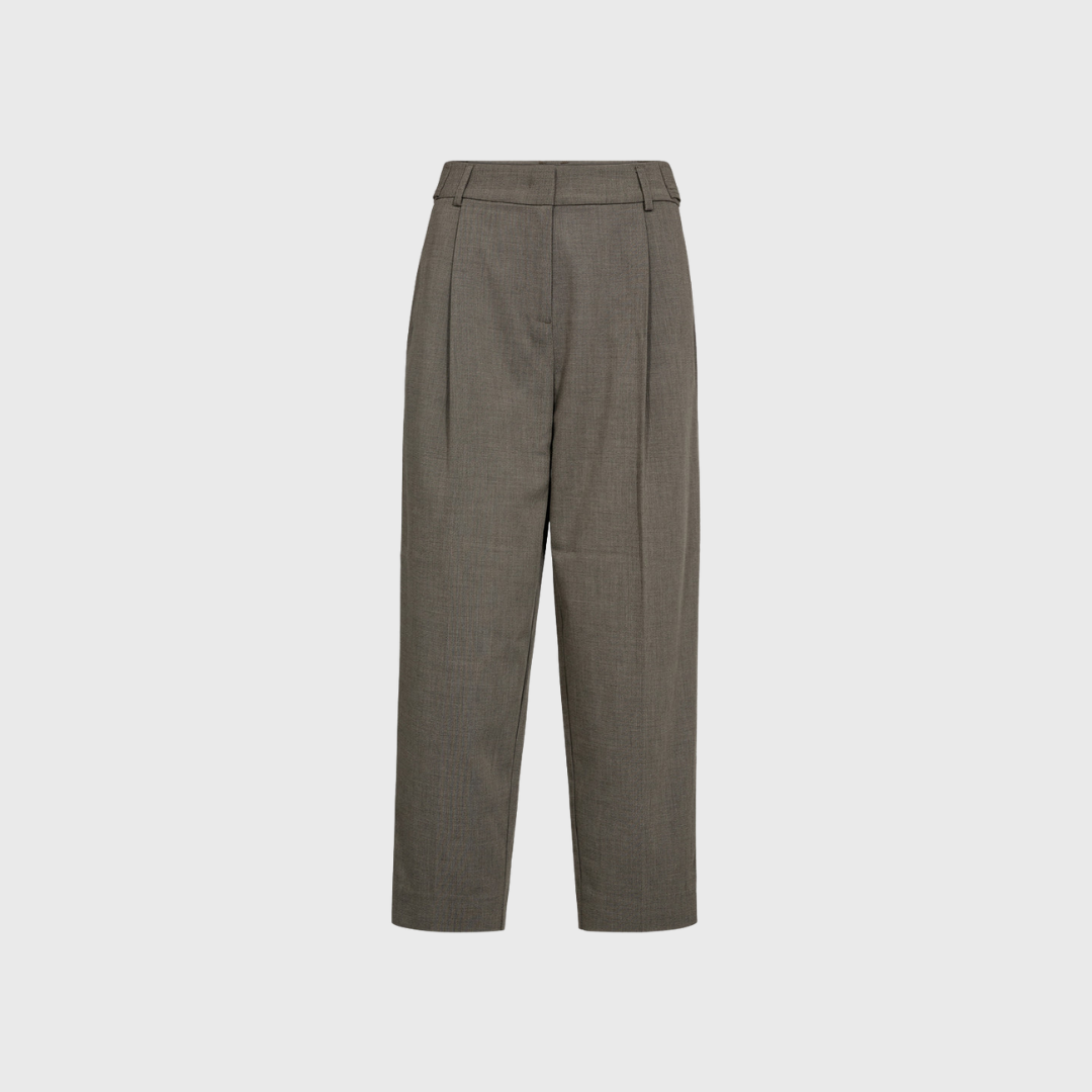 Nicole Crop Pant fra Haute L’Amitié er en elegant og moderne buks med cropped længde og klassisk melangé-look. Bukserne har en flatterende pasform med pressefolder, der giver et sofistikeret udtryk. Perfekt til både kontor og casual styling – kombiner med en skjorte, strik eller blazer for et chic look.