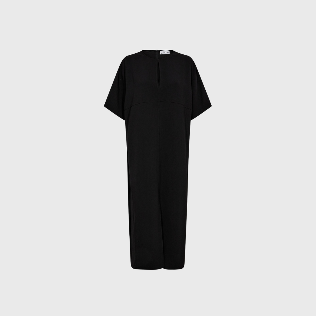 Satari Dress fra Haute L’Amitié er en elegant og minimalistisk kjole med et moderne udtryk. Kjolen har en løs pasform, korte ærmer og en flot slids foran, der giver et sofistikeret og feminint touch. Det enkle design gør den perfekt til både hverdag og fest – style med sneakers for et casual look eller med hæle for en mere dressed-up stil.