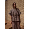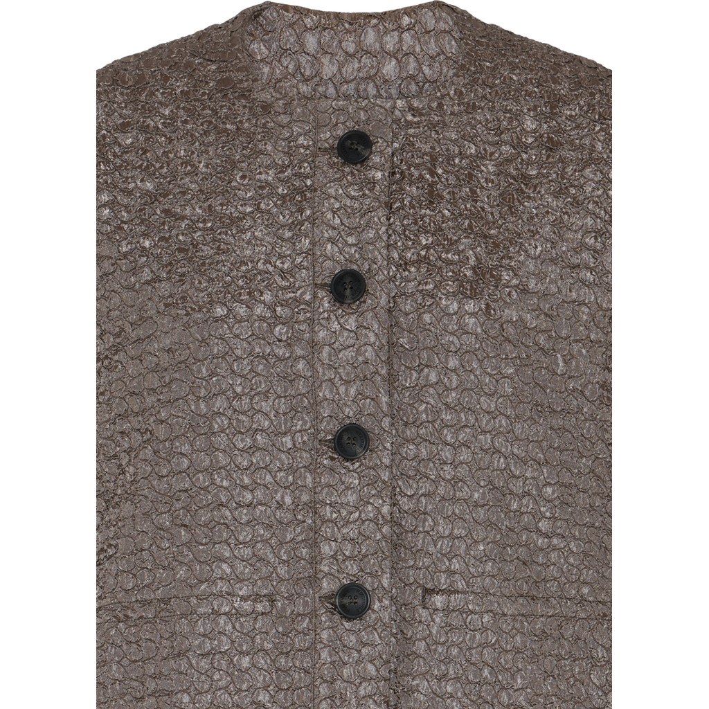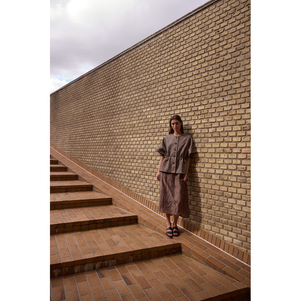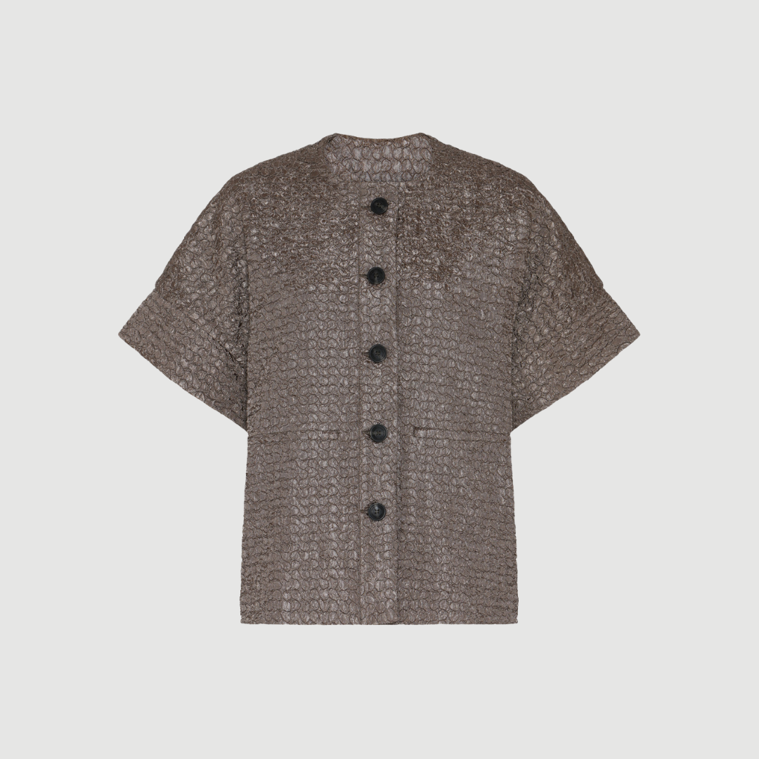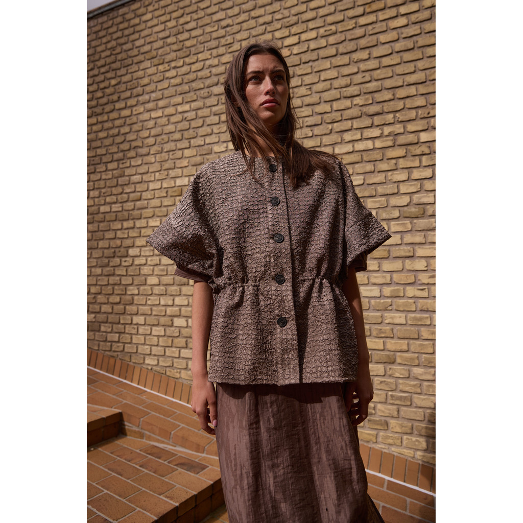 Capen har korte ærmer, rund halsudskæring og knaplukning foran, hvilket giver et enkelt, men arkitektonisk udtryk. Farven Walnut tilfører varme og dybde og gør capen nem at kombinere med både neutrale og mørkere nuancer.