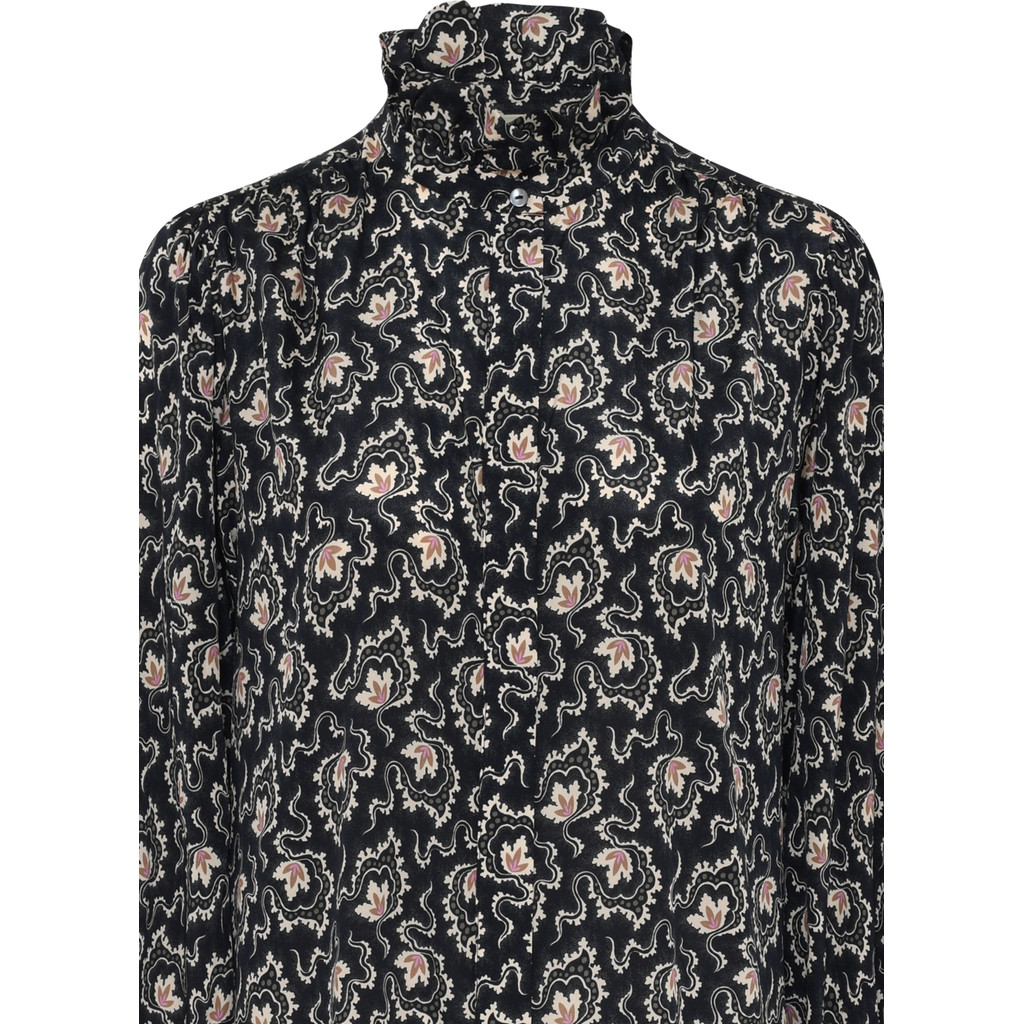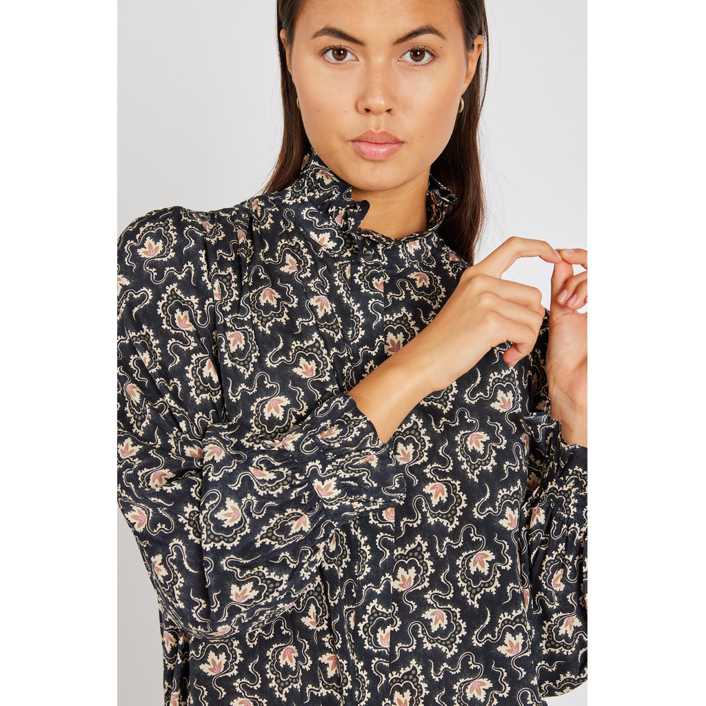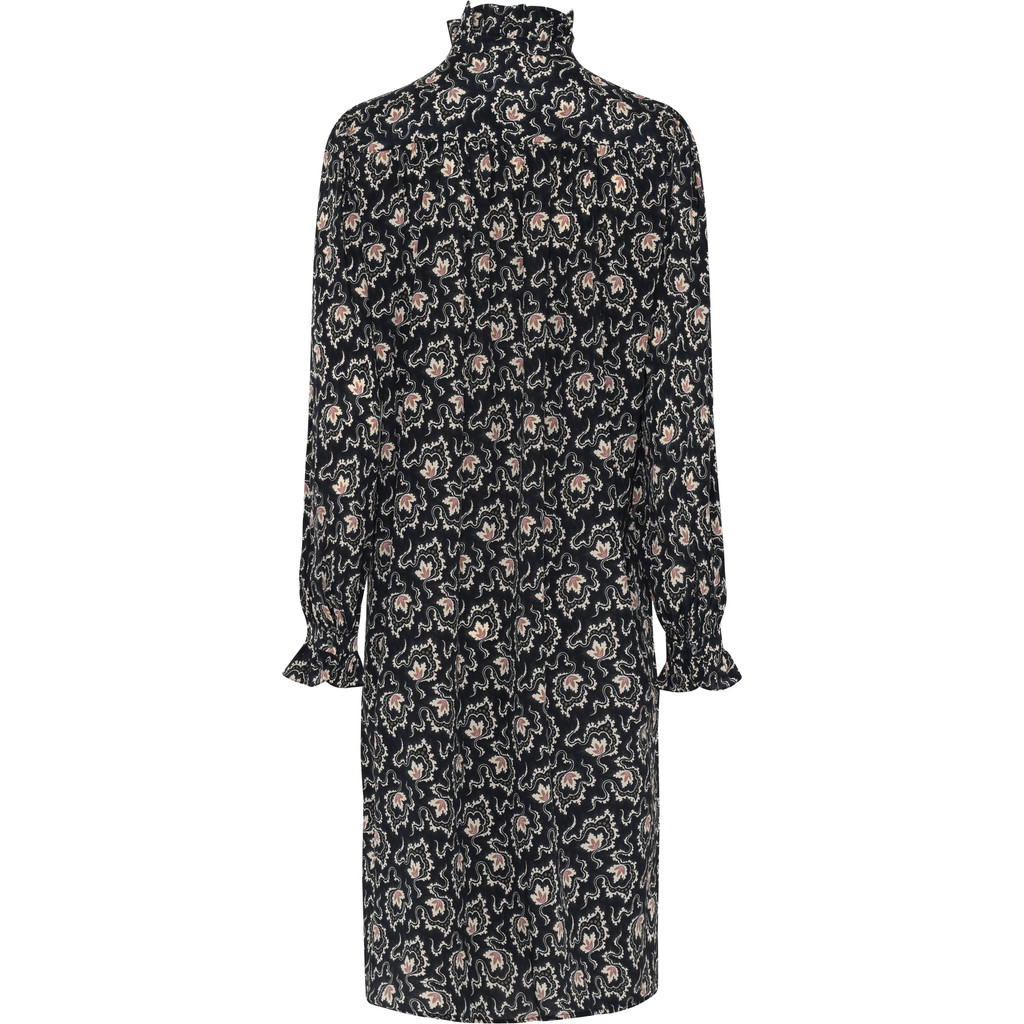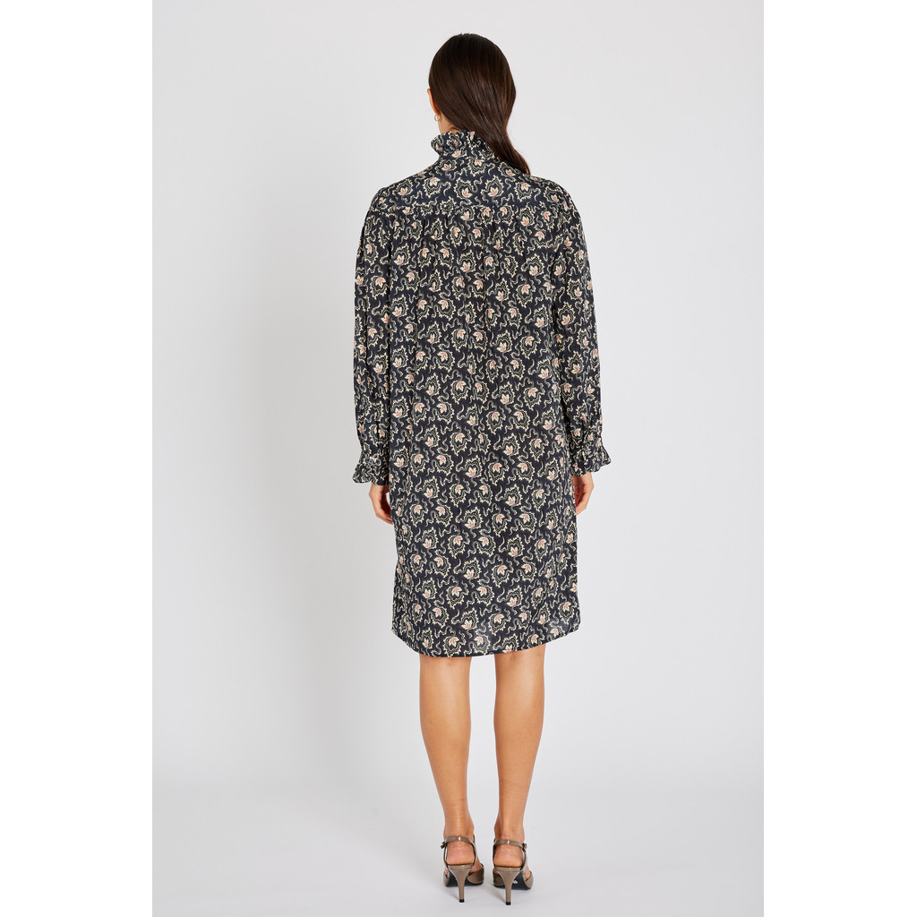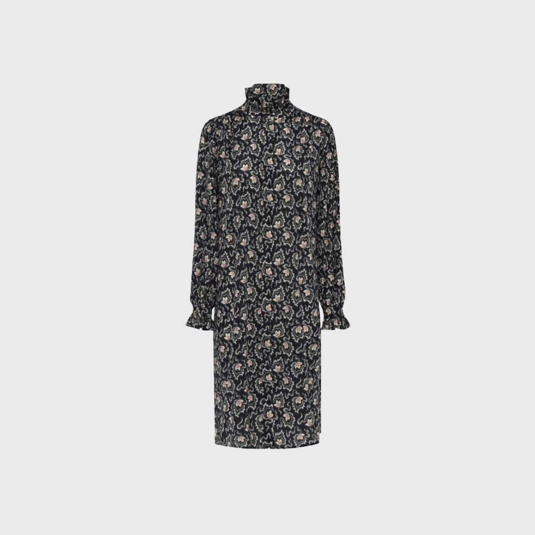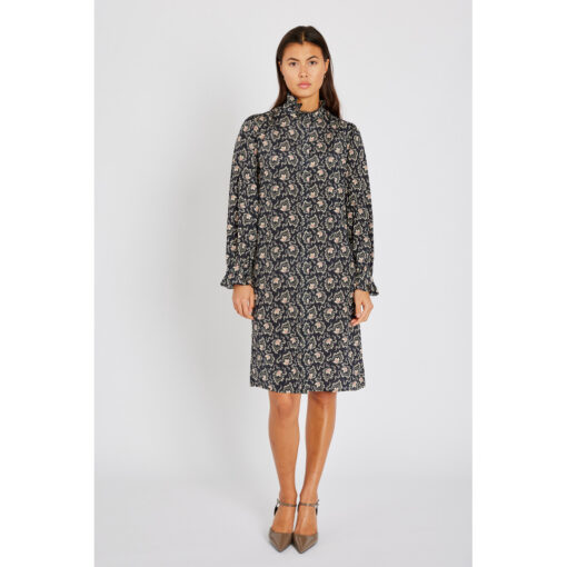 Helai Dress fra Heartmade er en elegant knælang kjole med et raffineret paisley-print i sæsonens farver. Kjolen har en afslappet pasform og er designet med høj flæsekrave, lange ærmer med elastiske manchetter og et let, flydende udtryk. Den ikoniske rhinsten-logo-detalje i nakken tilføjer et eksklusivt touch.
