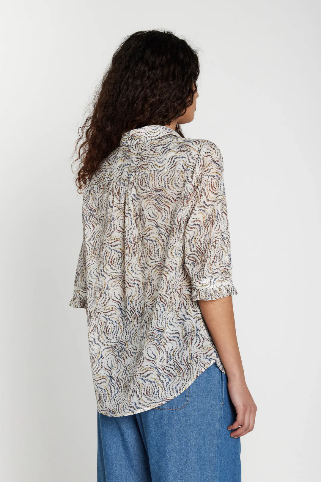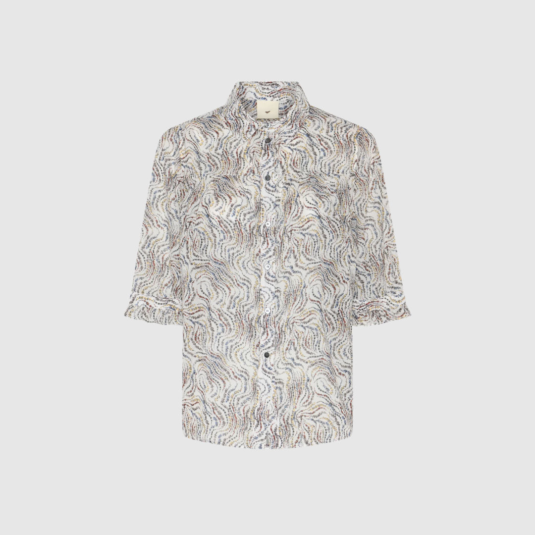 Den løstsiddende pasform skaber et luftigt fald, mens de korte ærmer med let vidde tilfører et blødt og raffineret look. Det bølgende blomsterprint giver skjorten liv og bevægelse og gør den perfekt sammen med ensfarvede bukser for et roligt udtryk eller denim for et mere afslappet look.