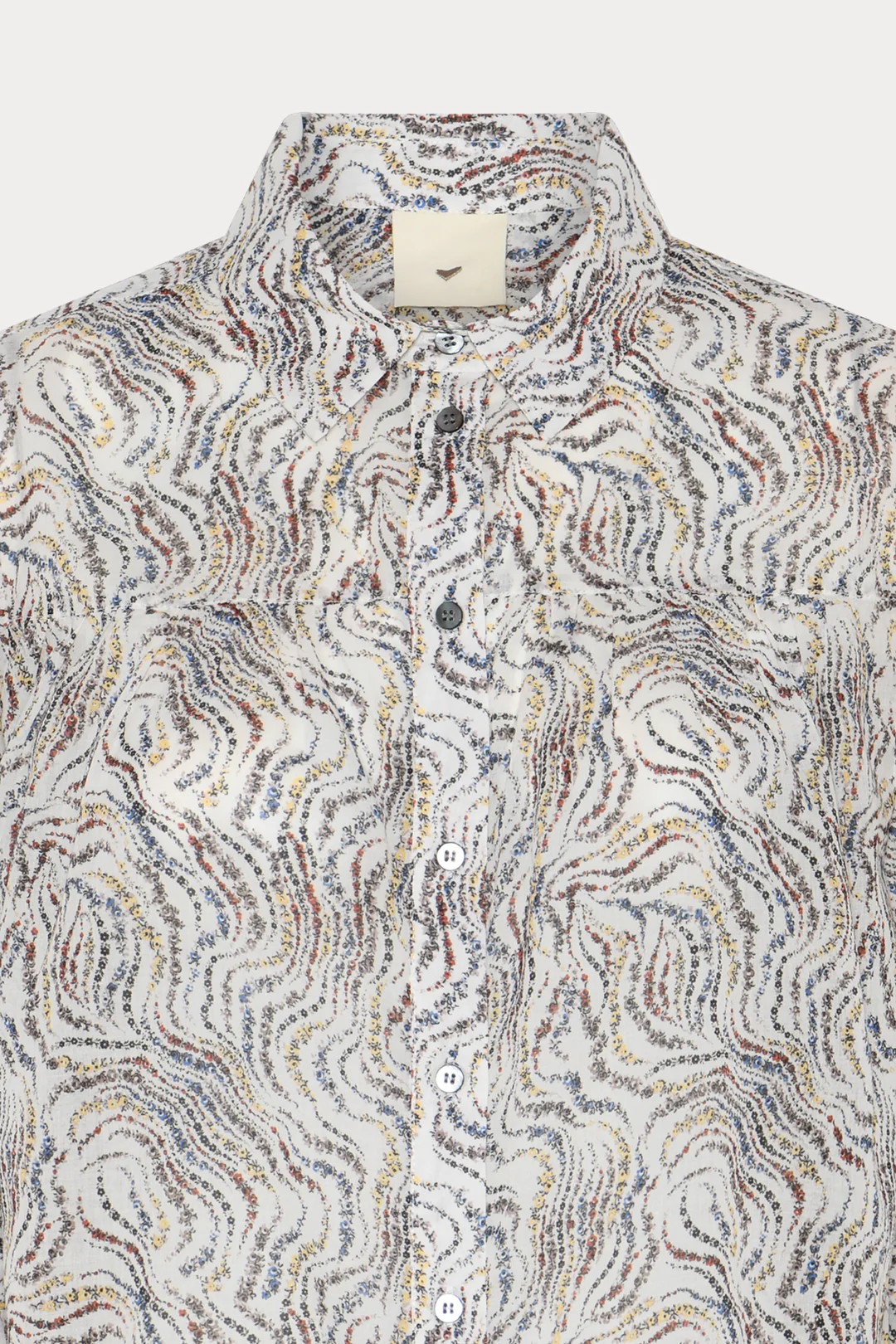 Skjorten er fremstillet i 100 % bomuld, hvilket giver en blød og åndbar kvalitet. Det lette materiale understøtter skjortens luftige fald og gør den behagelig at have på.