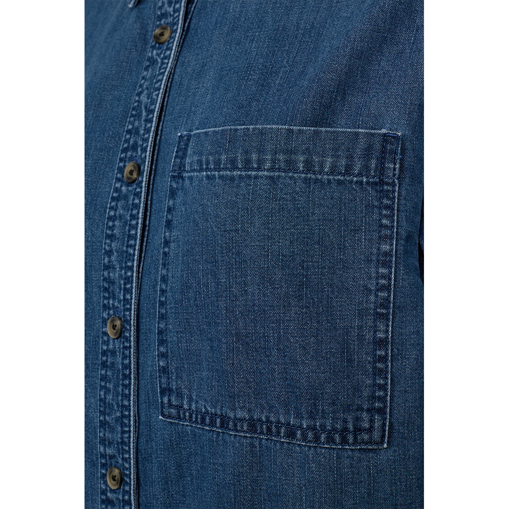 Den mørkeblå denimvask giver skjorten et tidløst look, der aldrig går af mode. Den matcher alt fra chinos og klassiske bukser til dine yndlingsjeans for et cool denim‑på‑denim outfit. Den ene brystlomme og de rene linjer gør udtrykket enkelt, mens knaplukningen sikrer klassisk funktionalitet.