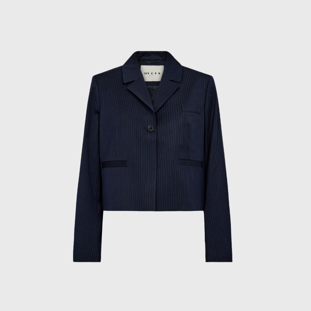 Paula Short Blazer fra IVY er en moderne fortolkning af den klassiske blazer – skræddersyet, cropped og med et cool, selvsikkert udtryk. Designet med rene linjer, skarpe revers og en boxy silhuet, der giver et sofistikeret look. De fine navy pinstriber tilfører et maskulint touch, mens den korte længde giver et feminint twist. Perfekt til både business og casual styling.