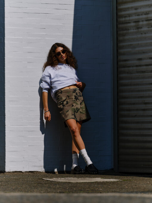 Designet er skabt som en faux-wrap miniskirt, hvor fronten overlapper med et markant side‑spænde, der giver et moderne, kantet udtryk. Den vaskede camouflage‑print (611 Camouflage) tilfører et råt og trendy look, som er perfekt til både hverdag, festival, forårsstyling eller et casual streetwear outfit.