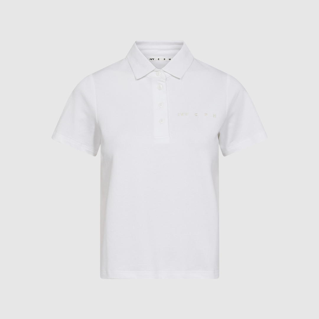 Poloen har en let cropped længde og en lige silhuet, som giver et moderne twist til den klassiske polo. Den rene hvide farve gør den utrolig alsidig og let at kombinere med både jeans, nederdele og klassiske bukser. Brug den alene for et afslappet, men stilrent look, eller style den med en blazer for et mere polished outfit.