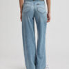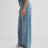 Benene er brede og løstsiddende hele vejen ned, hvilket giver en luksuriøs palazzo‑inspireret effekt. Den mellemblå denimvask har subtile highlights ved lår og knæ, der tilfører et autentisk, velafbalanceret udtryk – perfekt til både hverdags‑ og pænere looks.