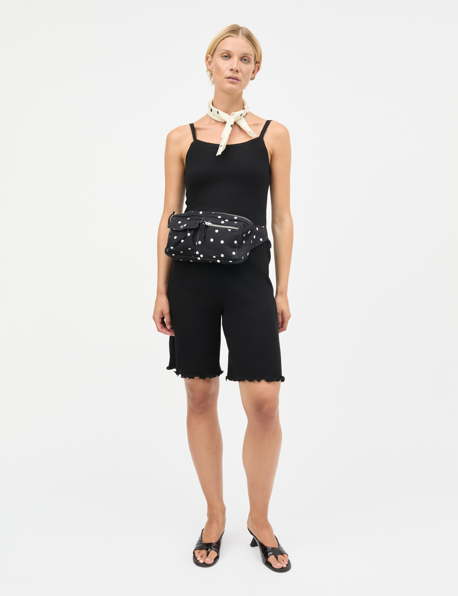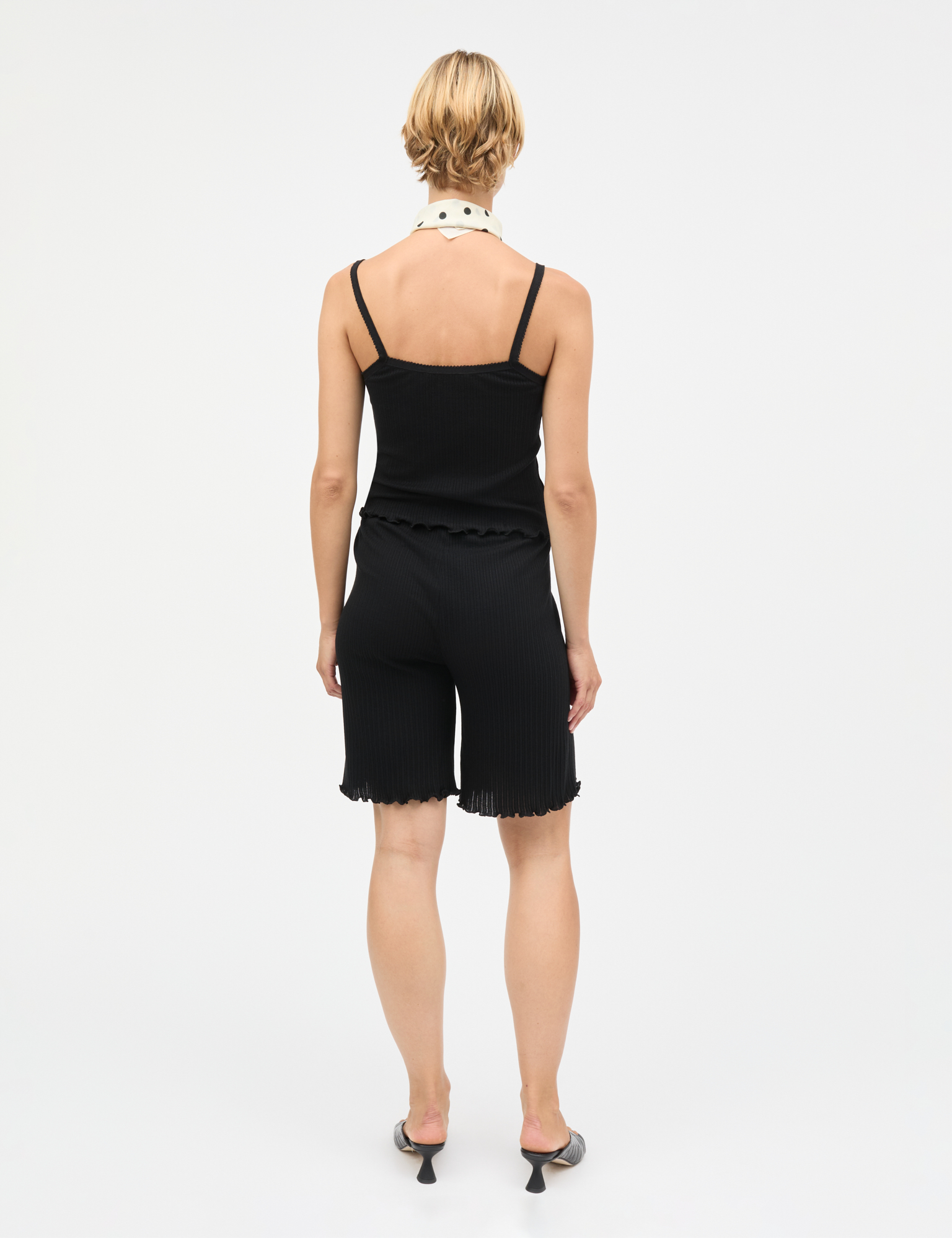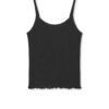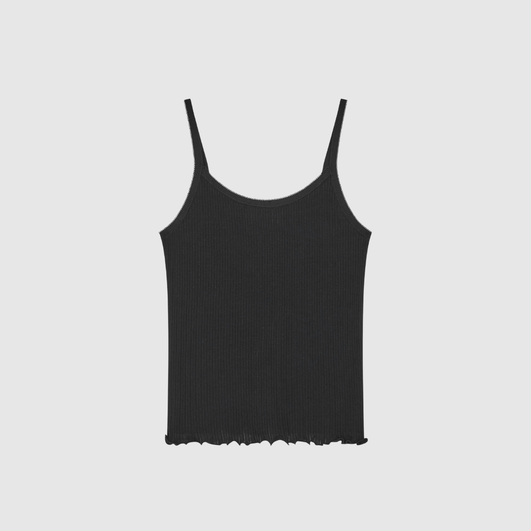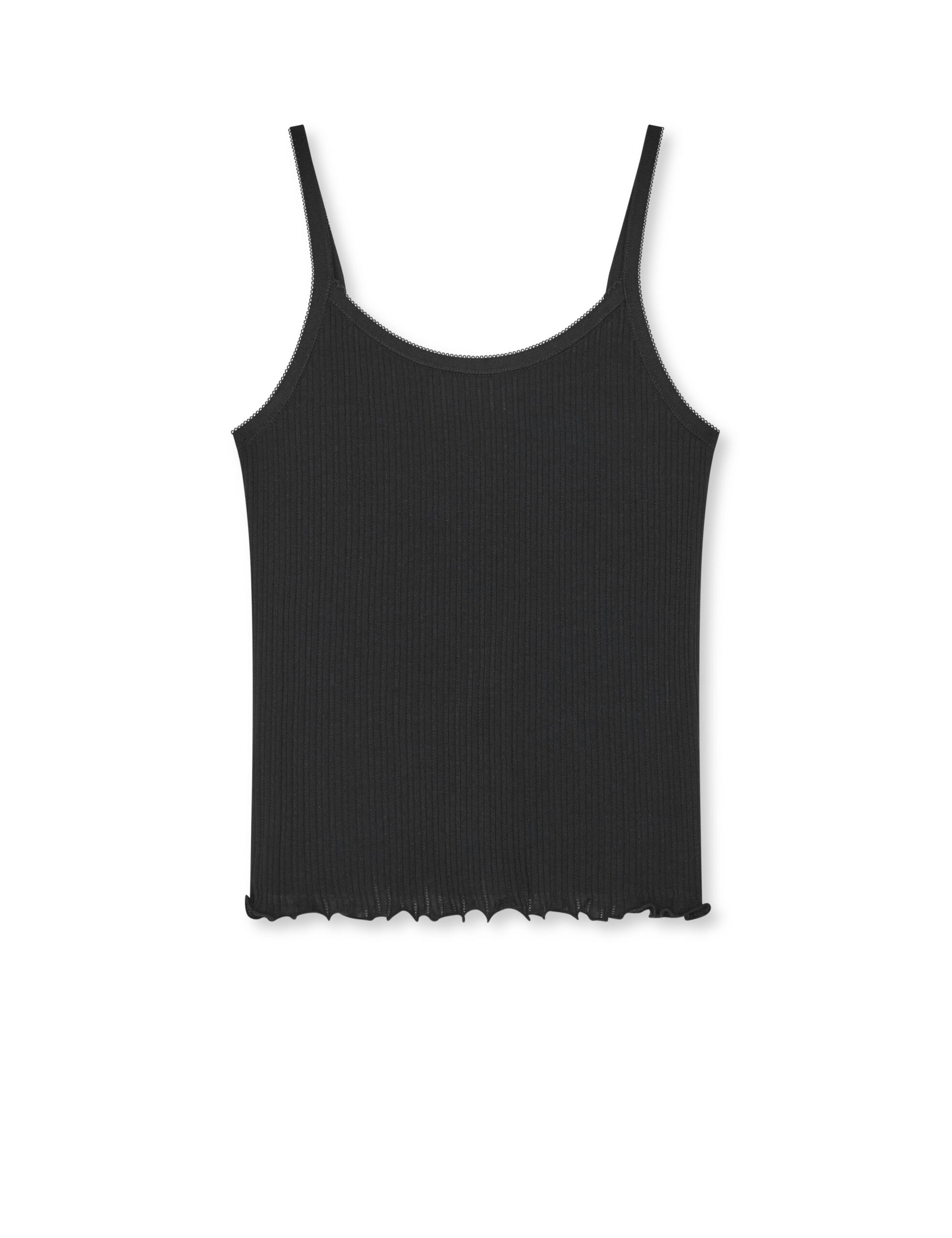 Designet har smalle stropper og en tætsiddende pasform, der smyger sig flot om kroppen. De fine bølgede kanter ved udskæring og bund tilfører et feminint og let udtryk, som gør toppen både anvendelig alene og perfekt som lag‑på‑lag under skjorter, strik eller blazere. Det sorte udtryk gør toppen ekstra alsidig og nem at style til både hverdag og aften.