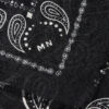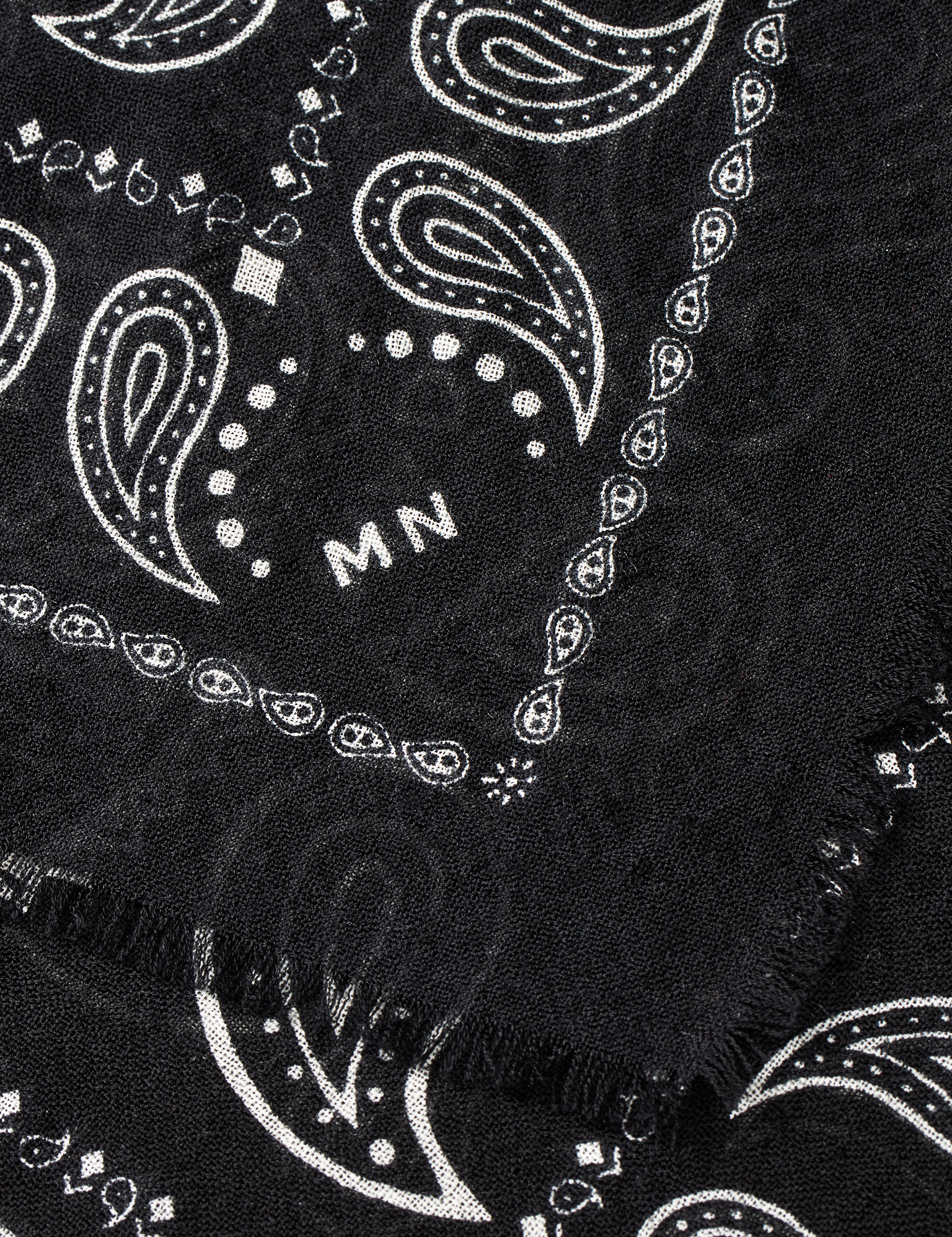 Et elegant og kvadratisk tørklæde fra Mads Nørgaard med klassisk paisley-mønster og logodetalje. Her i en sort variant med mønster og fremstillet i 100% uld – perfekt til både hverdagsbrug og som et stilfuldt lag til de kølige måneder.