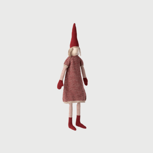 Maxi Pixy Girl fra Maileg er en charmerende julefigur, der bringer hygge og tradition ind i hjemmet. Hun er klædt i en klassisk rød kjole med fine detaljer og den ikoniske nissehue, som giver et autentisk og nostalgisk udtryk. Perfekt til at skabe julestemning på hylden, i vindueskarmen eller som en del af din juledekoration.