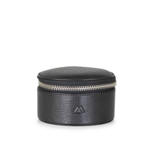 LovaMBG smykkeboksen fra Markberg indeholder 3 flade smykkepuder med 2 lommer i hver til fingerringe, øreringe og halskæder, samt 1 tyk smykkepude til tynde fingerringe og øreringe. Den har en fast rund form og lukkes med lynlås. Perfekt til at have med på farten