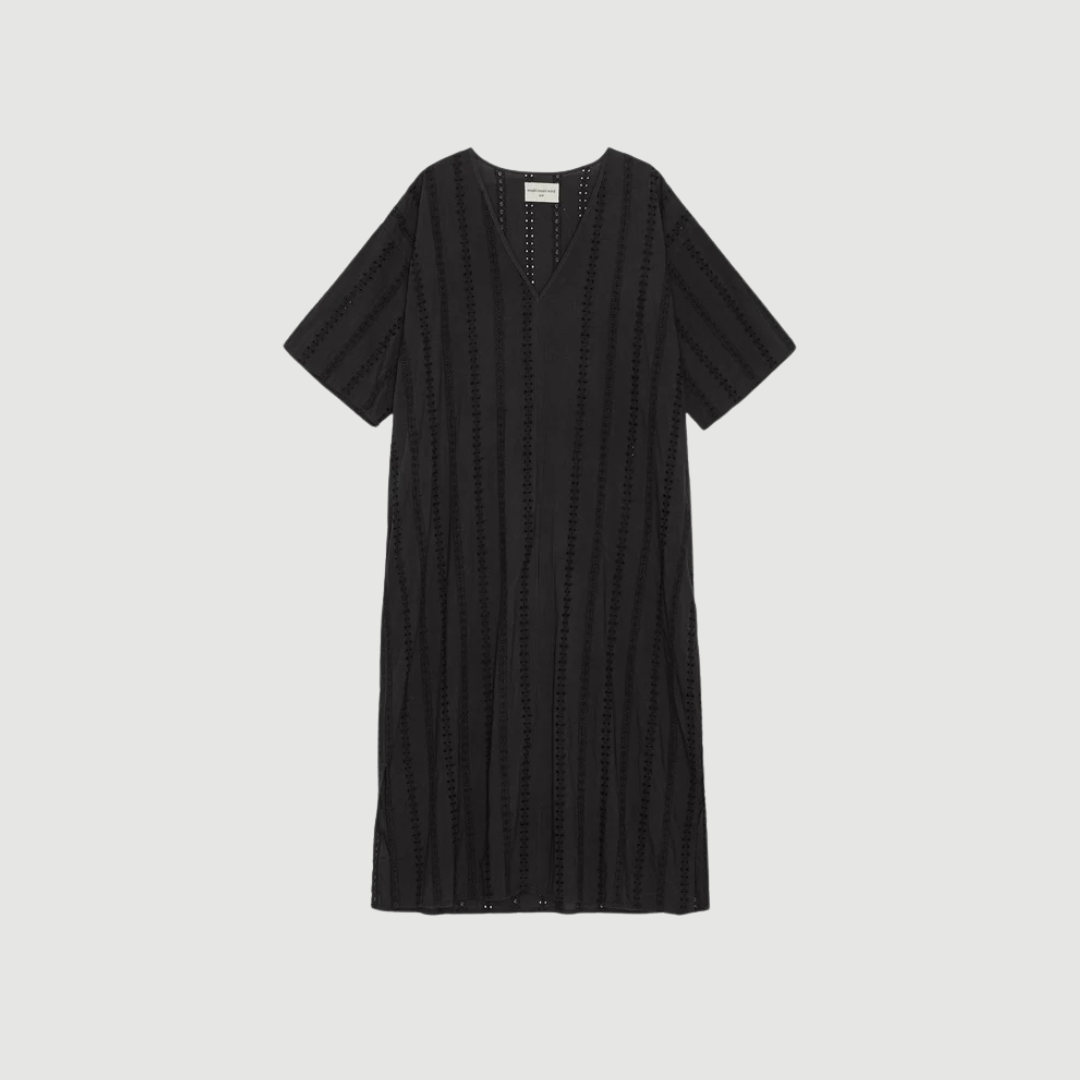 Luma Dress Anglaise fra moshi moshi mind er en let og elegant kjole med et afslappet, feminint udtryk. Kjolen er designet med en dyb V‑udskæring, mellemlange ærmer og et rummeligt snit, der falder smukt og ubesværet omkring kroppen.