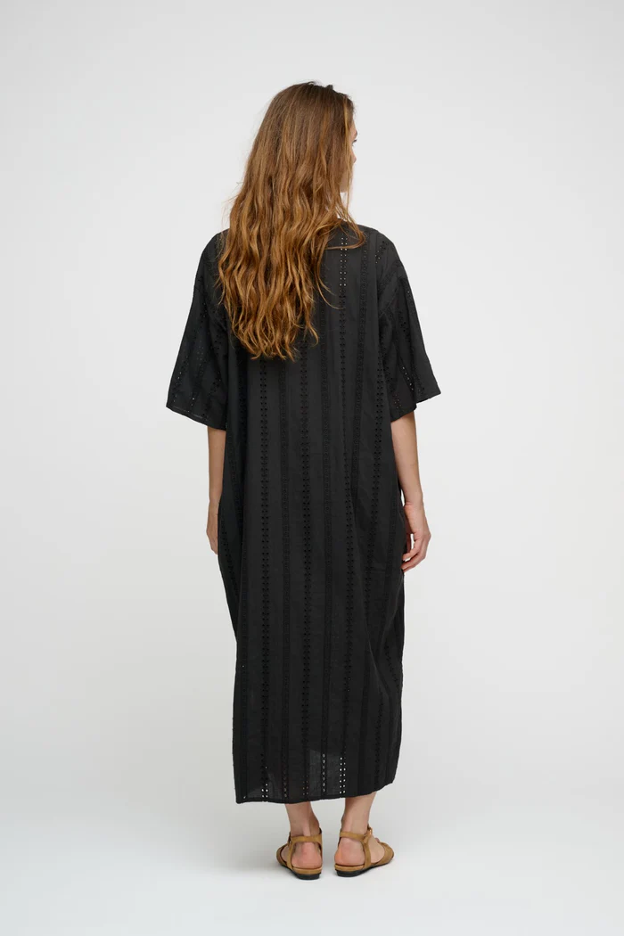 Det fine broderie anglaise giver kjolen struktur og et eksklusivt look, mens de praktiske sidelommer understreger den funktionelle og afslappede tilgang, som kendetegner moshi moshi mind. Farven Moonless Night – en klassisk, dyb sort – gør kjolen yderst anvendelig og let at style både til hverdag, ferie og mere pæne anledninger.
