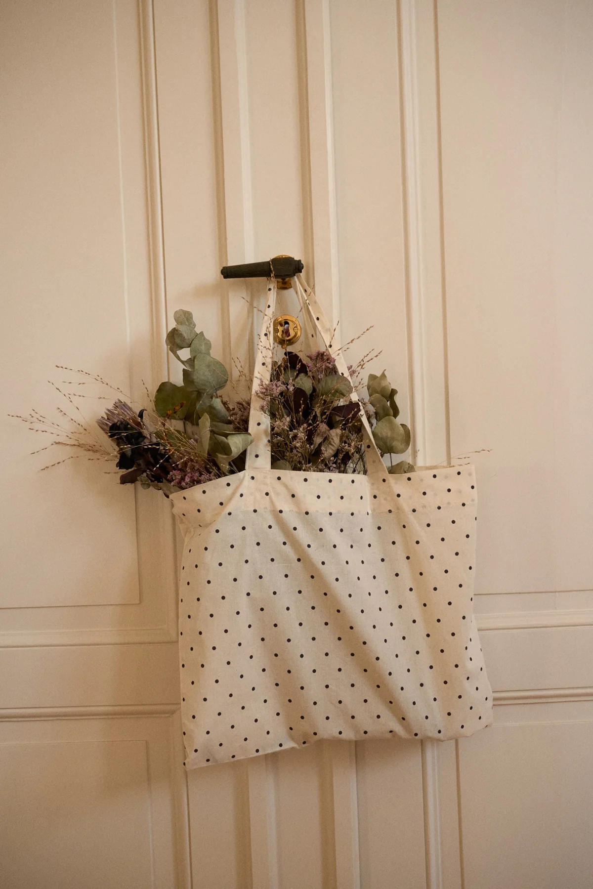 MEDIUM DOT BAG er en ægte Moshi Moshi Mind‑klassiker. Tasken er fremstillet i let, økologisk bomuld og dekoreret med brandets ikoniske prikker, som giver et legende og feminint udtryk.