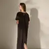 De korte raglanærmer og de fine, dekorative læg langs halsudskæringen tilfører kjolen et feminint og gennemtænkt look. En diskret slids med knaplukning i nakken samt en midterslids bagtil giver ekstra bevægelsesfrihed og et elegant finish. Farven Dark Brown er varm og tidsløs og egner sig perfekt til både hverdag, ferie og sommerens mere afslappede anledninger.