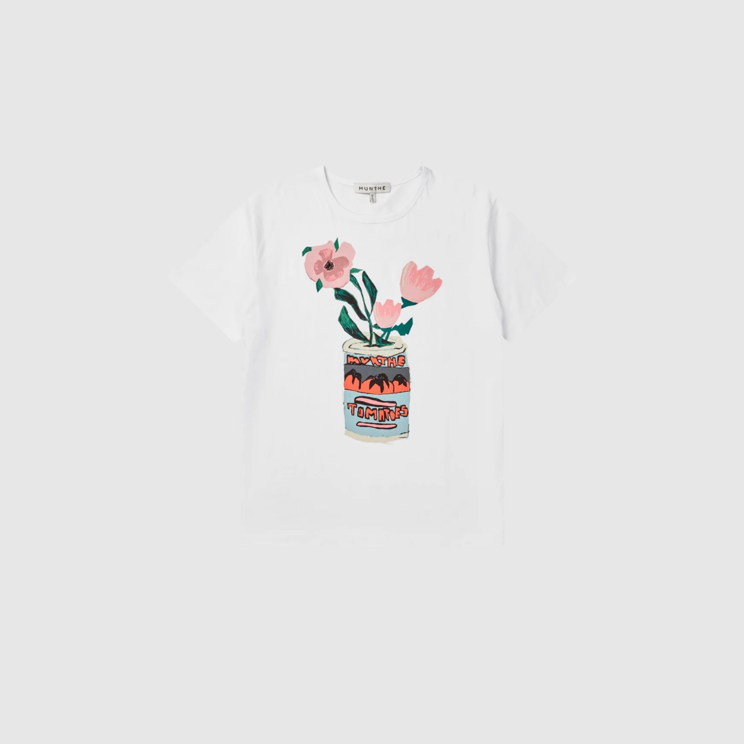 Balwin‑t-shirten fra MUNTHE er en moderne, kunstnerisk basic‑style, der kombinerer komfort, kvalitet og et grafisk, feminint udtryk. Den hvide jersey‑tshirt er pyntet med et smukt blomsterinspireret grafisk print, som giver den et kreativt og unikt udtryk – præcis det, MUNTHE er kendt for.