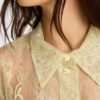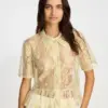 Den let transparente blonde har et fint, blomstrende mønster, som gør toppen både let og luksuriøs. De korte ærmer og den klassiske skjortekrave giver et stilrent look, mens de små, elegante knapper tilfører et diskret og eksklusivt finish. Nederst afsluttes toppen med en peplum‑kant, der skaber en flatterende silhuet og tilføjer et feminint, legende twist.