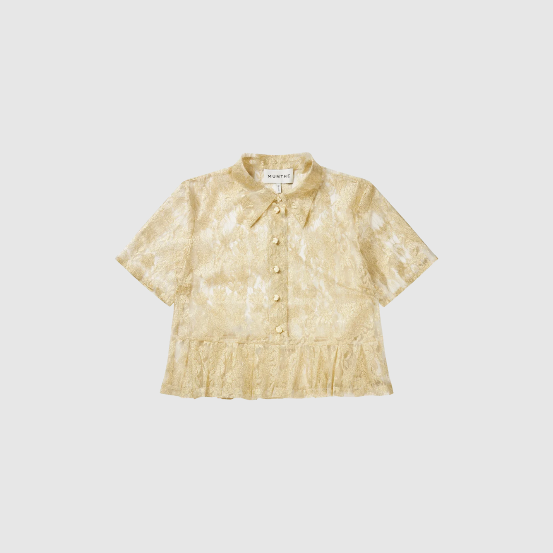 Bustona-toppen fra MUNTHE er en elegant, detaljerig og ultra‑feminin bluse skabt i smukt guldfarvet blonde. Blusen kombinerer klassisk skjorteæstetik med moderne delikate detaljer, hvilket giver et eksklusivt og sofistikeret udtryk.