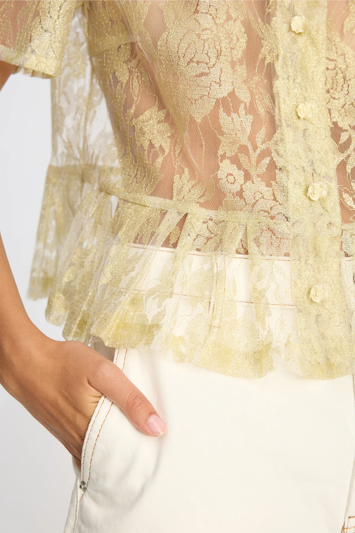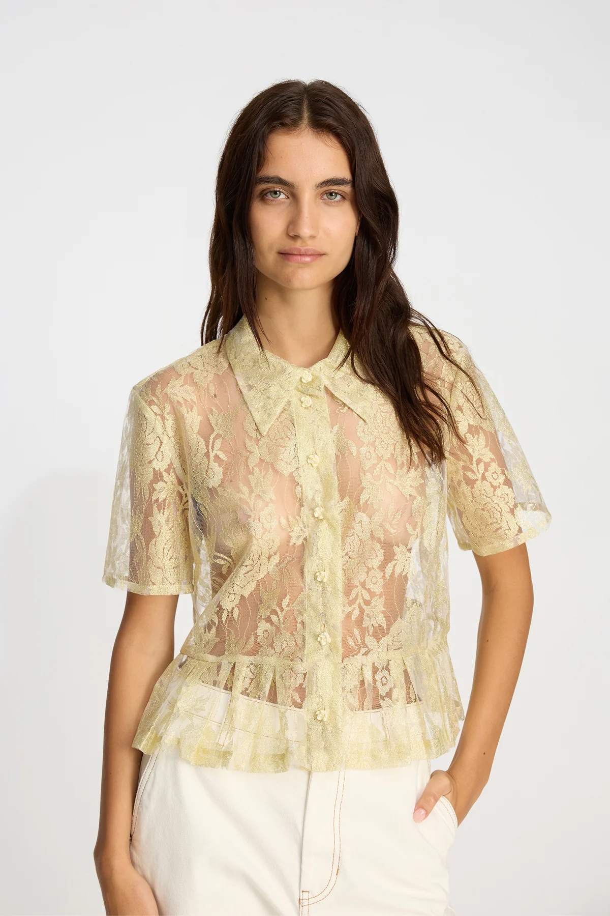 Den let transparente blonde har et fint, blomstrende mønster, som gør toppen både let og luksuriøs. De korte ærmer og den klassiske skjortekrave giver et stilrent look, mens de små, elegante knapper tilfører et diskret og eksklusivt finish. Nederst afsluttes toppen med en peplum‑kant, der skaber en flatterende silhuet og tilføjer et feminint, legende twist.