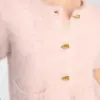 - Design: Korte ærmer, imiterede hornknapper, to lommer foran
