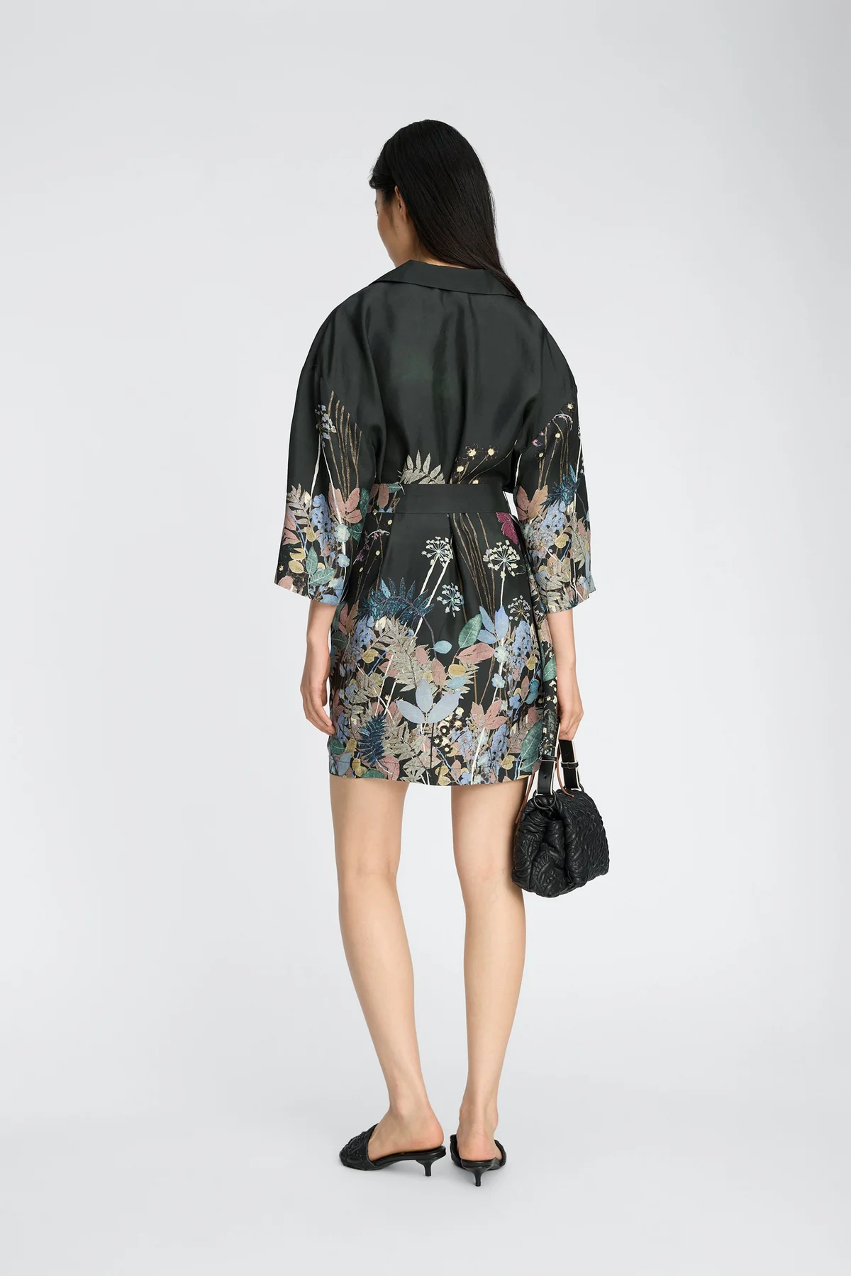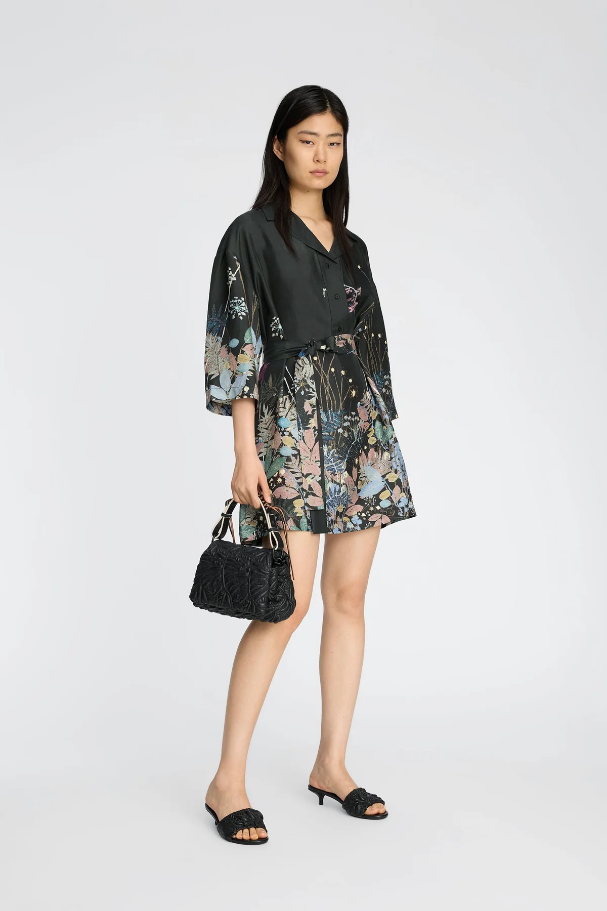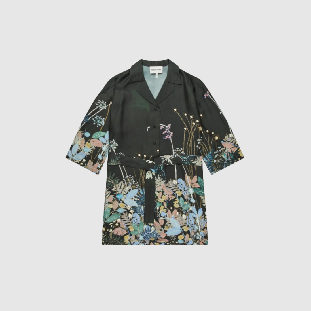 RATANA Dress er en elegant kjole i 100% silke med et smukt botanisk print. Designet med en løs, kort silhuet, skjortekrave, korte ærmer og et bælte i taljen, der fremhæver figuren på en sofistikeret måde. Hver style er unik, da printet placeres med fokus på minimalt materialespild – hvilket gør din kjole helt særlig.
